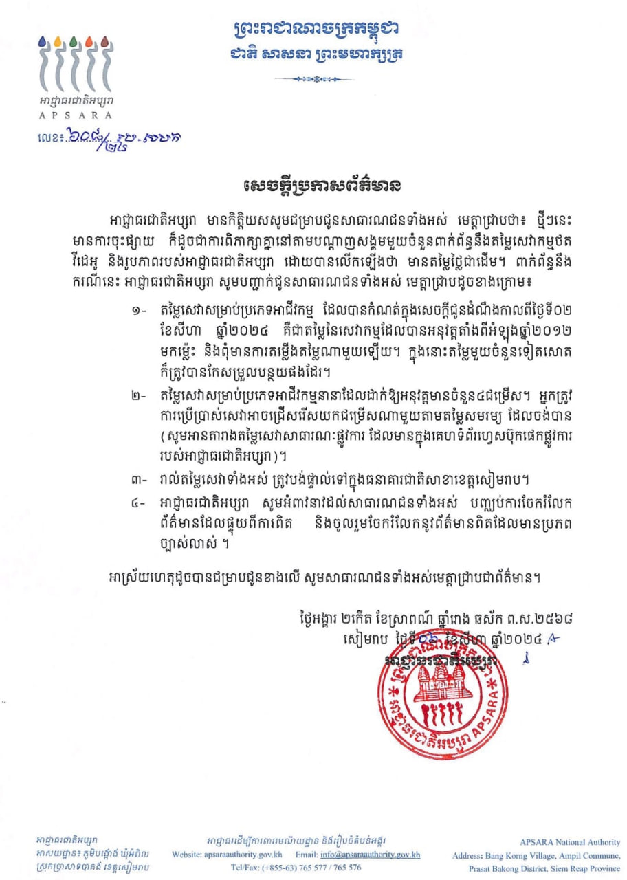 តាមលិខិតបកស្រាយបំភ្លឺរបស់អាជ្ញាធរជាតិអប្សរាបានឱ្យដឹងថា ថ្មីៗនេះ មានការចុះផ្សាយ ក៏ដូចជាការពិភាក្សាគ្នានៅតាមបណ្តាញសង្គមមួយចំនួនពាក់ព័ន្ធនឹងតម្លៃសេវាកម្មថត វីដេអូ និងរូបភាពរបស់អាជ្ញាធរជាតិអប្សរា ដោយបានលើកឡើងថា មានតម្លៃថ្លៃជាដើម។ ពាក់ព័ន្ធនឹង ករណីនេះ អាជ្ញាធរជាតិអប្សរា សូមបញ្ជាក់ជូនសាធារណជនទាំងអស់ មេត្តាជ្រាបដូចខាងក្រោម៖