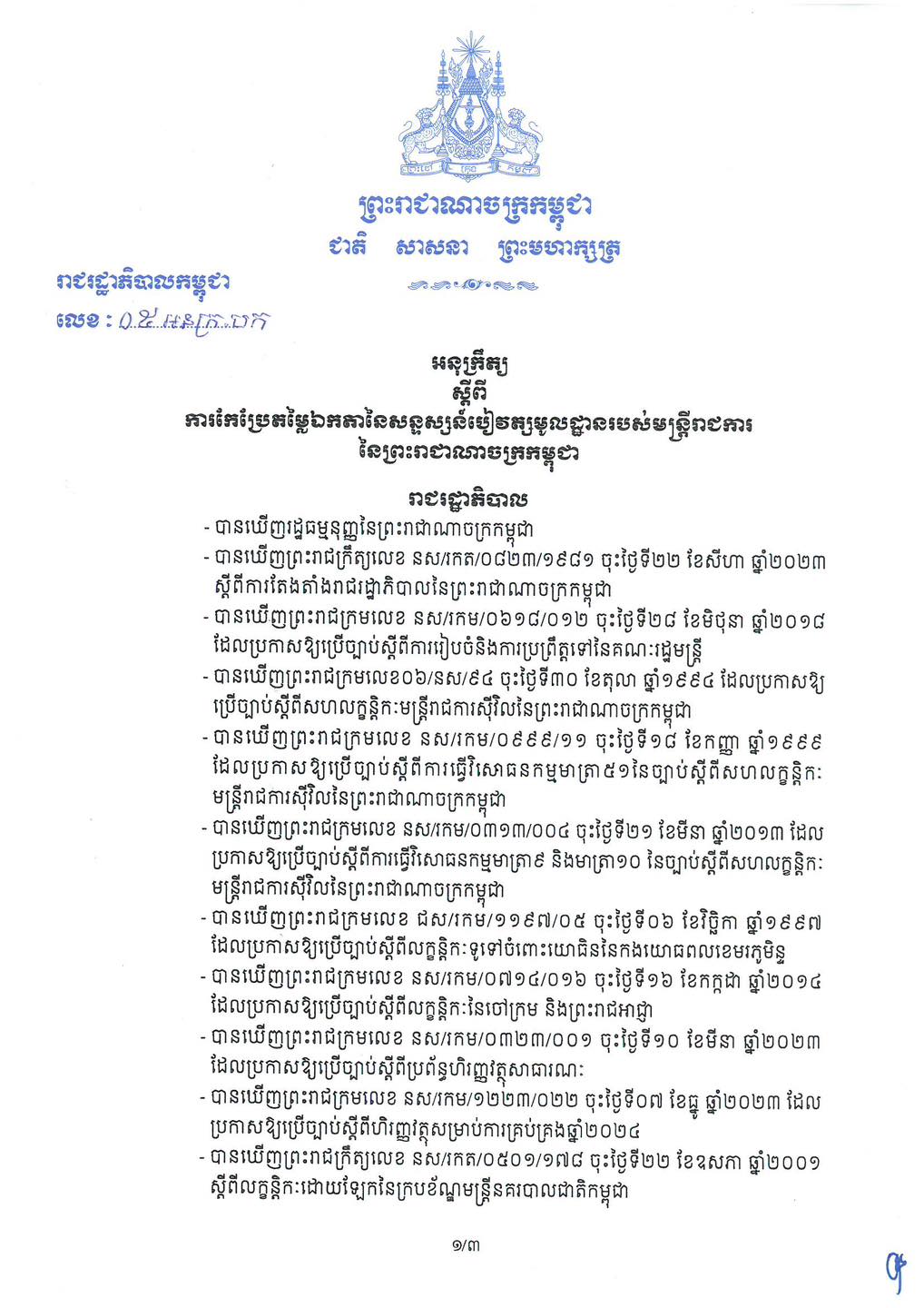 - ព្រះរាជក្រឹត្យស្តីពីលក្ខន្តិកៈដោយឡែកក្របខណ្ឌមន្ត្រីជាន់ខ្ពស់សវនកម្ម នៃអាជ្ញាធរសវនកម្មជាតិ