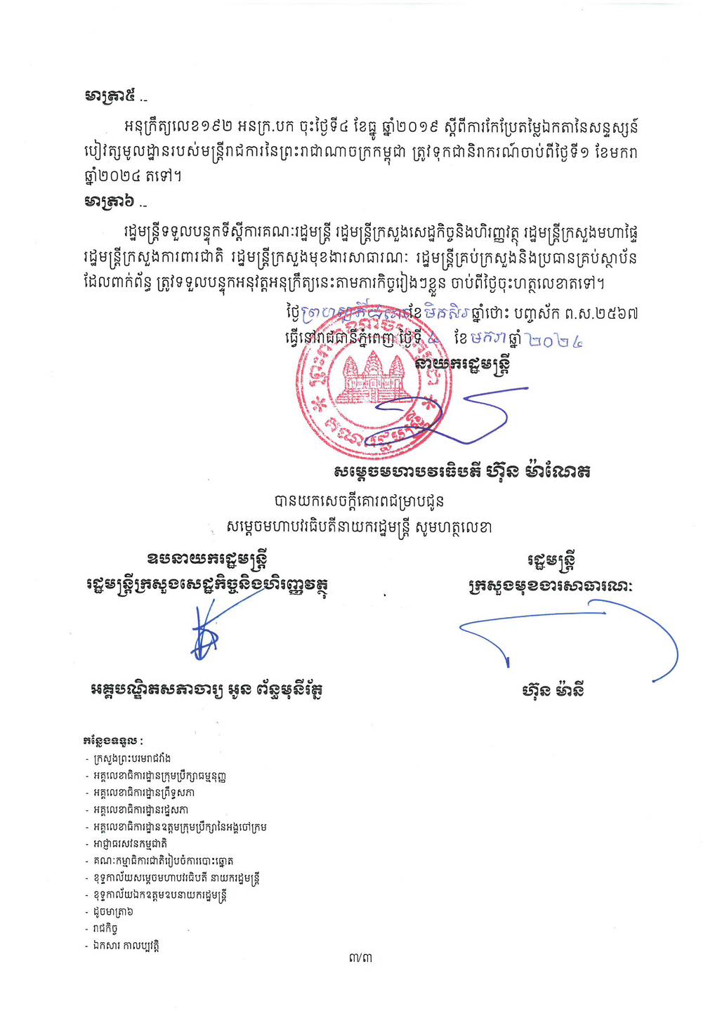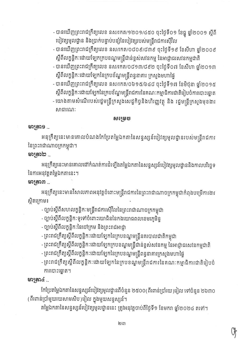 បើតាមអនុក្រឹត្យ ស្ដី ពីការកែប្រែតម្លៃឯកតានៃសន្ទស្សន៍បៀវត្យមូលដ្ឋានរបស់មន្ត្រីរាជការ នៃព្រះរាជាណាចក្រកម្ពុជា ដែលសម្ដេចធិបតី ហ៊ុន ម៉ាណែត នាយករដ្ឋមន្ត្រី នៃប្រទេសកម្ពុជា បានបង្ហោះនៅលើទំព័រហ្វេសប៊ុកផេកផ្លូវការ បានឱ្យដឹងថា រដ្ឋាភិបាលសម្រេចកែប្រែតម្លៃឯកតានៃសន្ទស្សន៍បៀវត្សមូលដ្ឋានរបស់មន្ត្រីរាជការ ពីចំនួន ២៥០០ (ពីរពាន់ប្រាំរយ) រៀល ទៅចំនួន ២៦៣០ (ពីរពាន់ប្រាំមួយរយសាមសិប) រៀល ក្នុងមួយសន្ទស្សន៍។ តម្លៃឯកតានៃសន្ទស្សន៍បៀវត្សមូលដ្ឋាននេះ ត្រូវអនុវត្តចាប់ពីថ្ងៃទី១ ខែមករា ឆ្នាំ២០២៤ តទៅ។