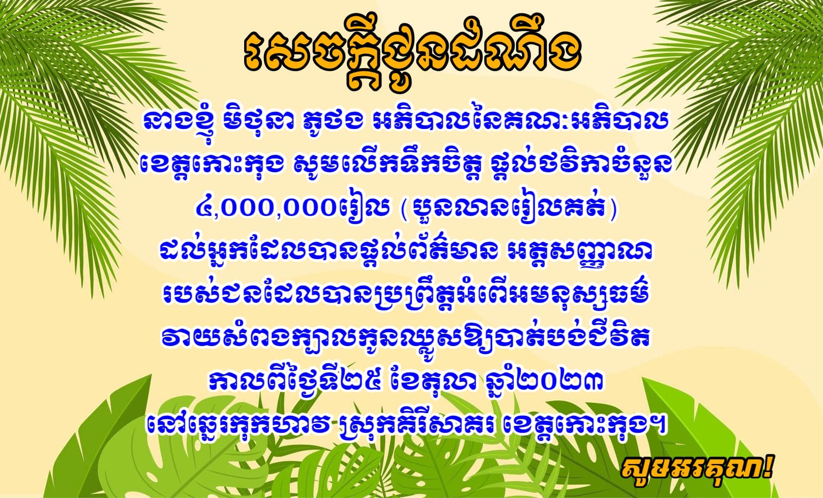 លោកជំទាវបន្តថា៖ «ពាក់ព័ន្ធករណីខាងលើ ខ្ញុំសូមលើកទឹកចិត្តជាថវិកាចំនួន ៤,០០០,០០០រៀល (បួនលានរៀល) ដល់អ្នកដែលបានផ្តល់ព័ត៌មាន អត្តសញ្ញាណ របស់ជនដែលបានប្រព្រឹត្តអំពើអមនុស្សធម៌ នូវភិនភាគរូបរាង ដូចដែលមាននៅក្នុងវីដេអូនេះ។ ចំពោះអ្នកដែលបានផ្តល់ព័ត៌មាននេះ យើងខ្ញុំនឹងរក្សាទុកជាការសម្ងាត់»។