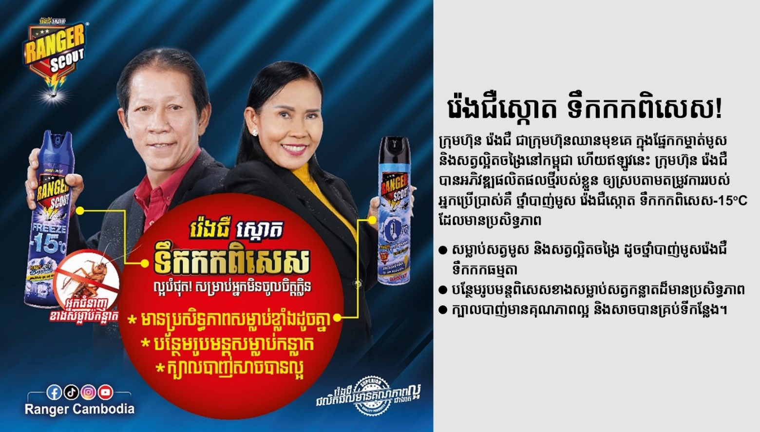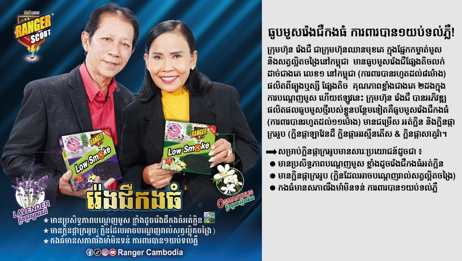 - បំបាត់មូសចង្រៃដោយប្រើផលិតផលរ៉េងជឺ (អ្នកជំនាញខាងសម្លាប់សត្វមូស និងរាល់សត្វល្អិតចង្រៃ) ដែលជារអង្គរក្សដ៏ល្អបំផុត សម្រាប់ការពារគ្រួសាររបស់លោកអ្នកពីជម្ងឺគ្រុនឈាម គ្រុនចាញ់ និងជំងឺគ្រុនឈីក ។