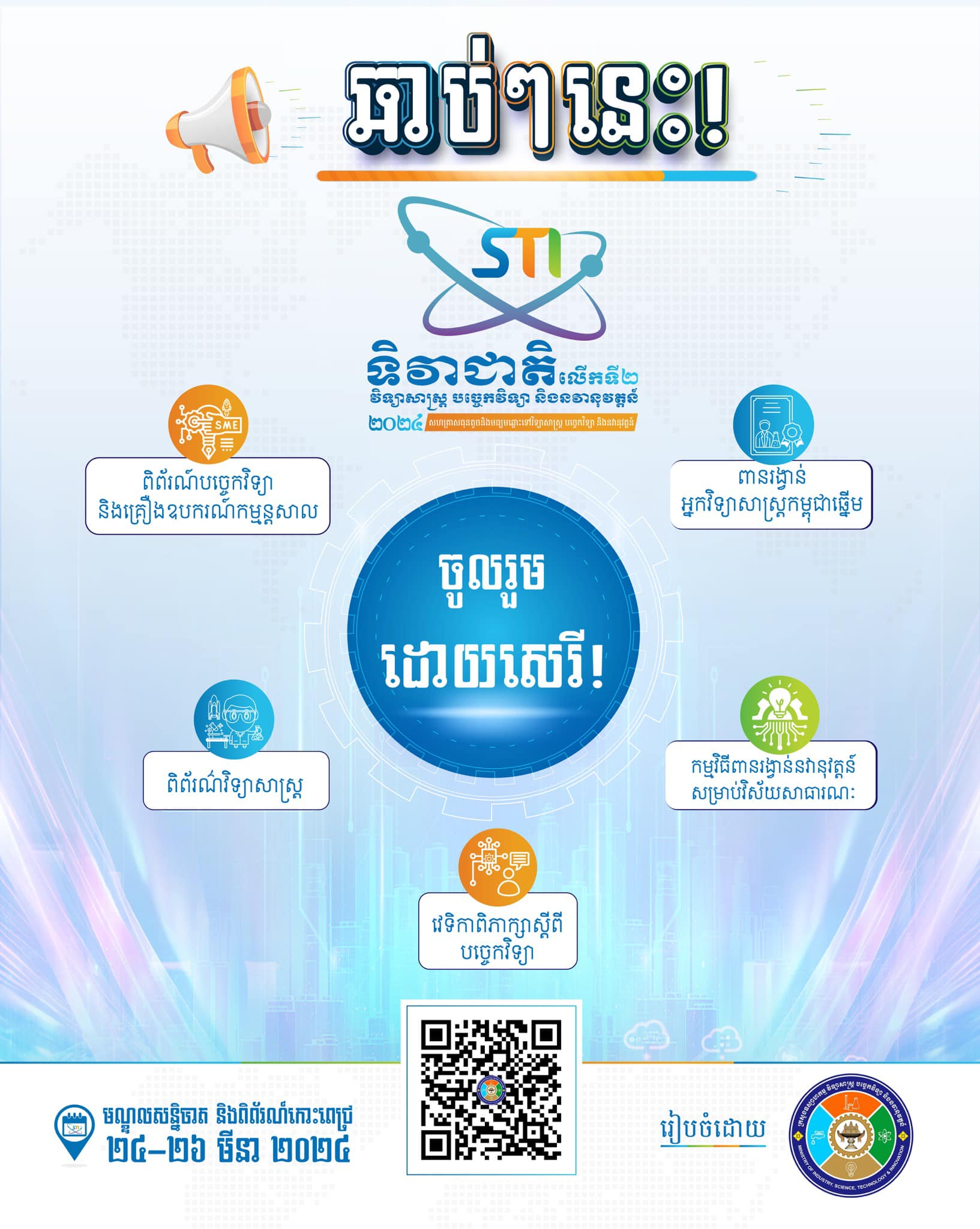 តស់! ណាត់គ្នា ទៅស្វែងយល់ពិភពនៃបច្ចេកវិទ្យា ស្វែងរកដំណោះស្រាយនវានុវត្តន៍ និងបង្កើតបណ្តាញទំនាក់ទំនងជាមួយអ្នកជំនាញ នៅក្នុងទិវាជាតិវិទ្យាសាស្ត្រ បច្ចេកវិទ្យា និងនវានុវត្តន៍លើកទី២ ឆ្នាំ២០២៤ ដែលនឹងប្រព្រឹត្តិឡើងរយៈពេល ៣ ថ្ងៃ ចាប់ពីថ្ងៃទី ២៤ រហូតដល់ថ្ងៃទី ២៦ ខែមីនា ២០២៤នេះ។