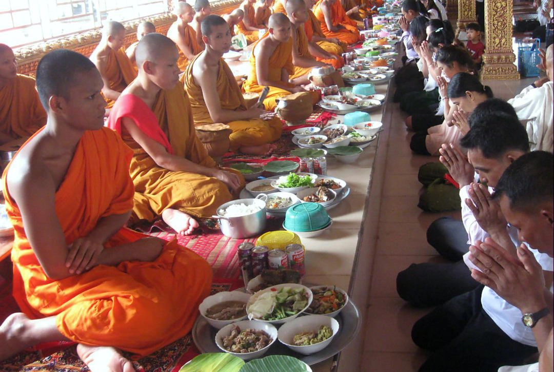 ទាក់ទិននិងរឿងនៃការកាន់បិណ្ឌនេះ នៅក្នុងគម្ពីរធម្មបទ បាននិទានថា «វេលាមួយមានព្រះរាជាមួយអង្គបានរៀបចំកម្មវិធីបុណ្យ ហើយមានមនុស្សចូលរួមរៀបចំកម្មវិធីបុណ្យច្រើនកុះករ ក្នុងអំឡុងនោះដែរ មានស្ត្រីម្នាក់មានកូនតូចមិនបានគោរពវិន័យដោយសារតែកូនយំខ្លាំងពេកទើបយកនំនោះឲ្យកូនហូបមុនព្រះសង្ឃ លុះស្ត្រីនោះបានស្លាប់ទៅក៏បានក្លាយទៅជាប្រេតត្រូវរស់នៅស្រេកឃ្លានចំណីអាហារអស់កាលជាយូរជាច្រើនជំនាន់ព្រះពុទ្ធ។ លុះដល់ព្រះសមណគោតមត្រាស់ដឹងឡើងក្នុងលោកនេះ ពួកប្រេតទាំងនោះក៏បានមកសួររកចំណីអាហារពីព្រះអង្គ។ ក្រោយពីបានស្ដាប់ដឹងថាខ្លួននឹងអាចទទួលចំណីអាហារមកពីញាតិខ្លួនដោយផ្ទាល់ ពួកប្រេតទាំងនោះក៏បានទៅស្រេកយំអឺងកងនៅជុំវិញព្រះបរមរាជវាំងរបស់ព្រះបាទពិម្ពិសារ។ លុះព្រឹកឡើងព្រះបាទពិម្ពិសារក៏បានយករឿងនេះទៅទូលសួរព្រះសម្ពុទ្ធ ទើបបានដឹងថាពួកប្រេតទាំងនោះគឺជាសាច់ញាតិរបស់ខ្លួន។ ព្រះសម្មាសម្ពុទ្ធទ្រង់ក៏បានត្រាស់សំដែងឲ្យព្រះបាទពិម្ពិសារធ្វើបុណ្យឧទ្ទិសកុសលទៅឲ្យពួកគេ ប៉ុន្តែព្រះបាទពិម្ពិសារ មិនបានធ្វើបុណ្យដោយផ្ទាល់នោះទេ ទើបពួកប្រេតដែលជាញាតិរបស់ព្រះអង្គមិនទទួលបានចំណីអាហារ។ ពួកគេនៅតែបន្តយំរហូតព្រះបាទពិម្ពិសារ បានទូលសួរទៅព្រះពុទ្ធអង្គម្ដងទៀត ព្រះសម្មាសម្ពុទ្ធទ្រង់សម្ដែងប្រាប់ថាមហារាជត្រូវតែធ្វើបុណ្យឧទ្ទិសកុសលដោយខ្លួនឯងផ្ទាល់ទើបពួតប្រេតដែលជាញាតិរបស់ព្រះអង្គអាចទទួលបាននូវផលទាំងនោះ ហើយបានរសាយទុក្ខផងទាំងពួង»។