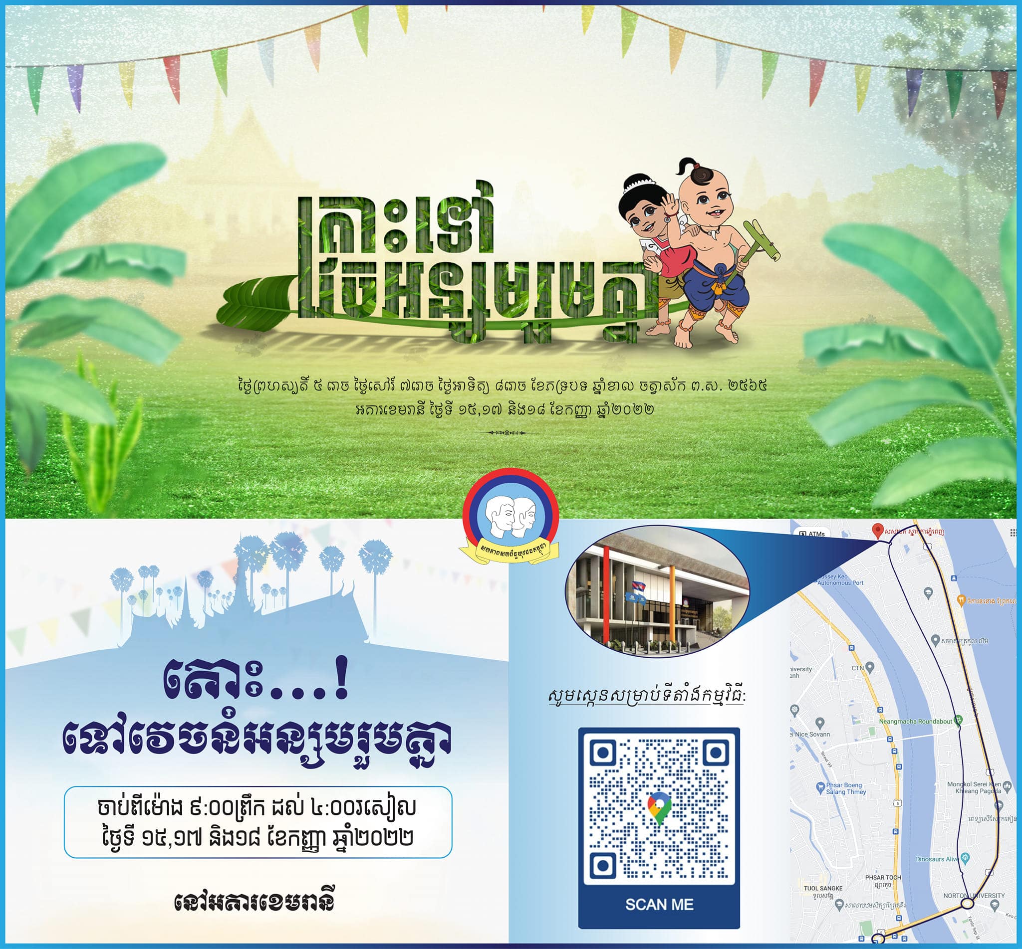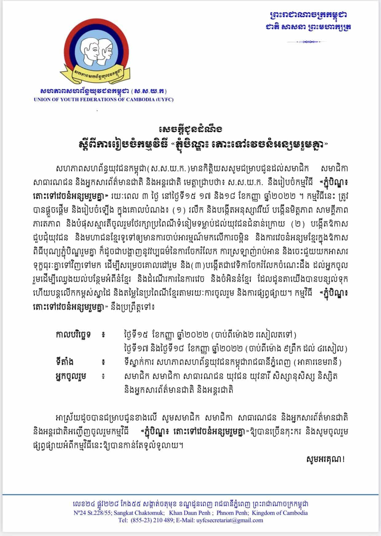 បងប្អូនប្រជាពលរដ្ឋខ្មែរអាចចូលរួមដោយសេរី ក្នុងកម្មវិធី «ភ្ជុំបិណ្ឌ៖ តោះទៅវេចនំអន្សមរួមគ្នា» នៅទីស្នាក់ការ ស.ស.យ.ក. រាជធានីភ្នំពេញ អគារខេមរានី ដែលនឹងប្រព្រឹត្តទៅនៅថ្ងៃទី ១៥ ១៧ និង១៨ ខែកញ្ញា ឆ្នាំ ២០២២ ហើយក៏ត្រូវនឹងបិណ្ឌ ៥ បិណ្ឌ៧ និងបិណ្ឌ៨ នាពេលខាងមុខឆាប់ៗនេះហើយ។