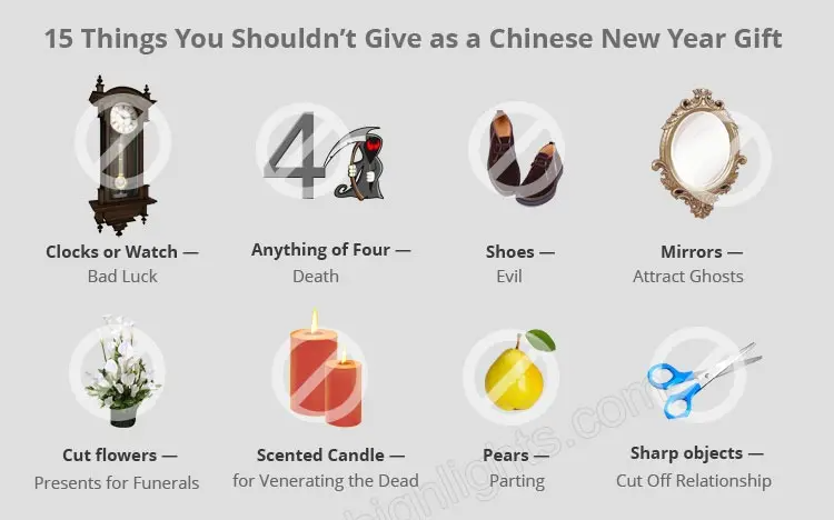 ការជូននាឡិកាក្នុងថ្ងៃចូលឆ្នាំចិនតំណាងឲ្យសំណាងអាក្រក់។ ក្នុងវប្បធម៌ចិន ពាក្យឲ្យនាឡិកាមានសំនៀងស្រដៀងទៅនឹងពាក្យ ចូលរួមពិធីបុណ្យសព្វ ដែលគេគិតថាការយកនាឡិកាធ្វើជាអំណោយផ្សេងៗទៅកាន់អ្នកដទៃជាសំណាងអាក្រក់។ ម្យ៉ាងទៀតនាឡិកាតំណាងឲ្យការអស់ពេលវេលា បើសិនអ្នកជូននាឡិកាទៅកាន់រៀមច្បងឬចាស់ៗវារឹតតែជាប្រផ្នូលអាក្រក់ដែលក្នុងវប្បធម៌ចិនគេមិនដែលធ្វើឡើយ។