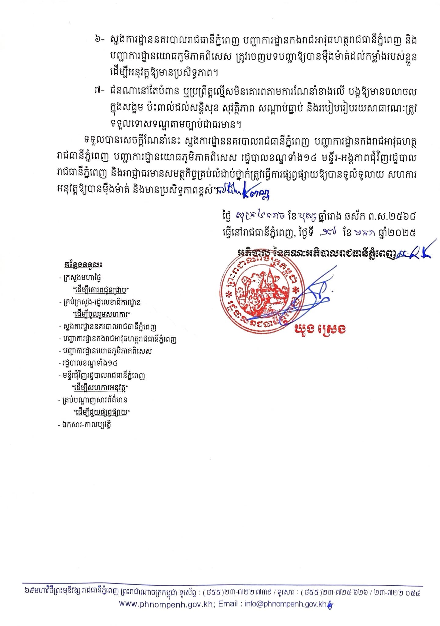 ជាចុងក្រោយ រដ្ឋបាលរាជធានីភ្នំពេញសុំឱ្យក្រសួងពាក់ព័ន្ធទាំងអស់ចូលរួមក្នុងការផ្សព្វផ្សាយណែនាំដល់មន្ត្រីក្រោមឱវាទ និងប្រជាពលរដ្ឋដើម្បីការអនុវត្តទទួលបានប្រសិទ្ធភាពខ្ពស់។ ក្នុងករណីមានជនដែលបំពានឬល្មើសការណែនាំខាងលើនឹងត្រូវទទួលទោសទណ្ឌតាមច្បាប់ជាធរមាន៕