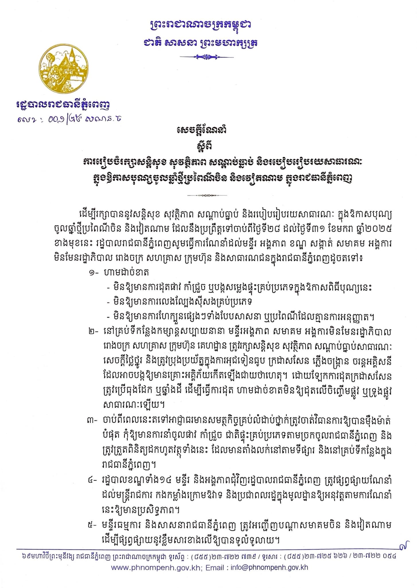 នាឱកាសបុណ្យចូលឆ្នាំប្រពៃណីចិន និងវៀតណាមខាងមុខនេះ រដ្ឋបាលរាជធានីភ្នំពេញចេញសេចក្ដីប្រកាសហាមមិនឱ្យមានសកម្មភាពមួយចំនួនដាច់ខាតមួយចំនួន ដើម្បីធានាបាននូវសន្តិសុខ សណ្ដាប់ធ្នាប់ និងរបៀបរៀបរយសាធារណៈ។