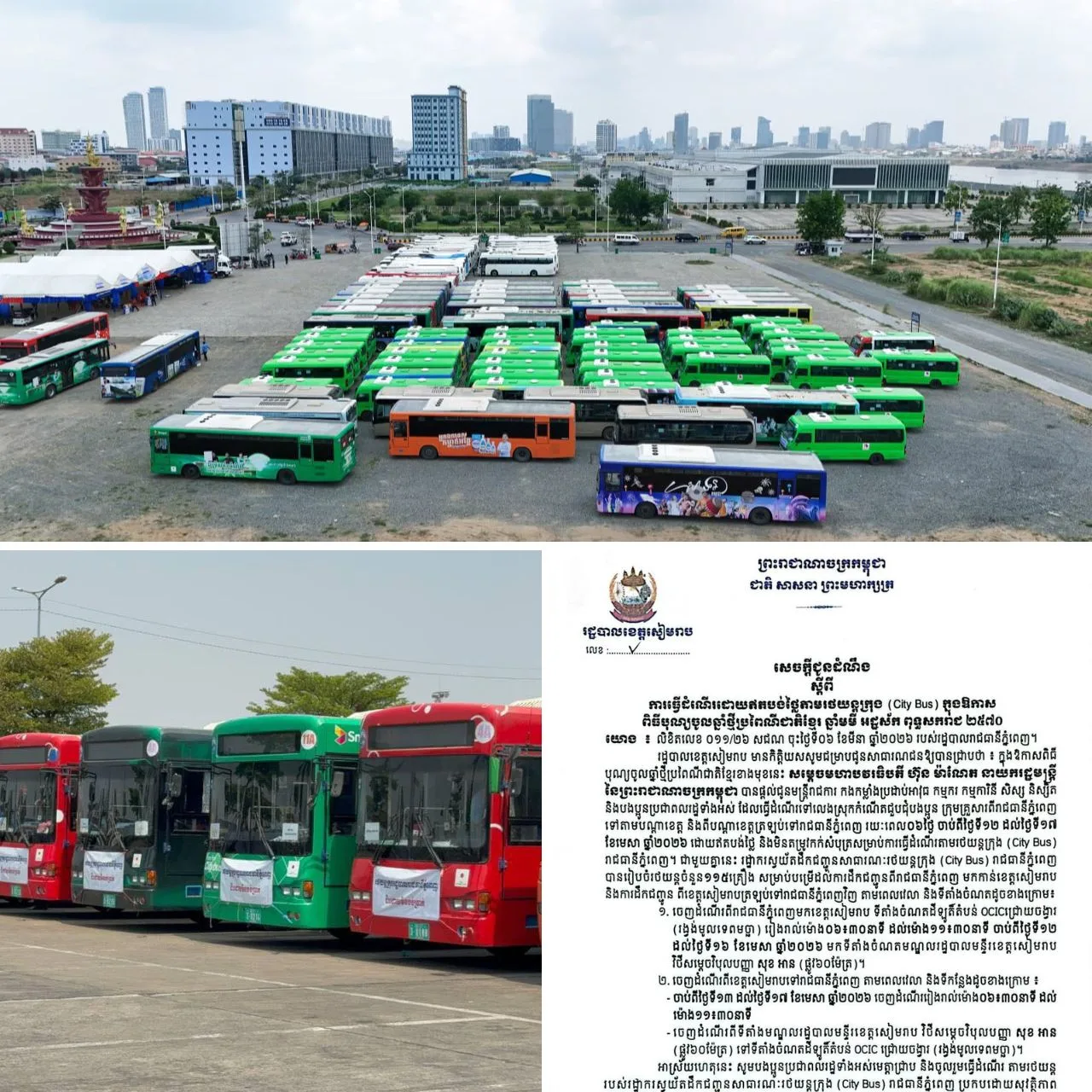 តាម​រយៈសេចក្ដី​ជូន​ដំណឹង​របស់​រដ្ឋបាល​ខេត្ត​សៀមរាប បាន​ឱ្យ​ដឹង​ថា ចាប់​ពី​ថ្ងៃ​ទី ១២ ដល់ ១៧ ខែមេសា ឆ្នាំ ២០២៦ រដ្ឋាករ​ស្វយ័ត​ដឹក​ជញ្ជូន​សាធារណៈ​រថយន្ត​ក្រុង (City Bus) បាន​បញ្ចេញ​រថយន្ត​ក្រុង ១១៥ គ្រឿង ដើម្បី​សម្រួល​ក្នុង​ការ​ធ្វើ​ដំណើរ​របស់​សាធារណជន​ទាំង​អស់​ទៅ​កាន់​ខេត្ត​សៀមរាប ក្នុង​អំឡុង​ពិធី​បុណ្យ​ចូល​ឆ្នាំ​ខ្មែរ​នា​ពេល​ខាង​មុខ​ ក៏ដូច​ជា​ការ​ធ្វើ​ដំណើរ​វិល​ត្រឡប់​មកកាន់​ភ្នំពេញ​វិញ។