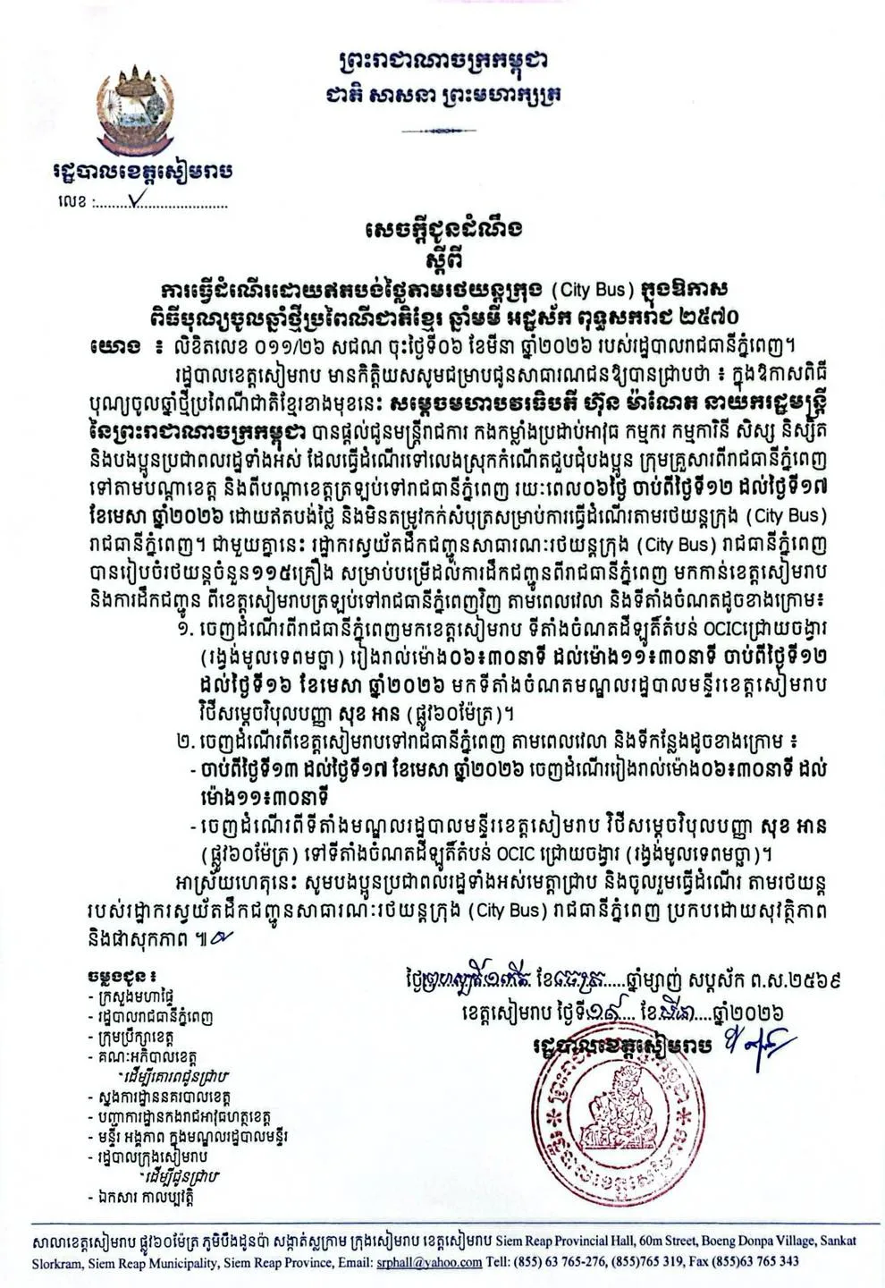 ក្នុង​ឱកាស​នៃ​ពិធី​បុណ្យ​ចូល​ឆ្នាំ​ខ្មែរ រដ្ឋបាល​ខេត្ត​សៀមរាប បាន​ជូន​ដំណឹង​អំពី​ការ​ធ្វើ​ដំណើរ​ដោយ​រថយន្ត​ក្រុង (City Bus) ទៅមកភ្នំពេញ​​-​សៀមរាប ដោយ​ឥត​គិត​ថ្លៃ សម្រាប់​សាធារណៈ​ជន​ទាំង​អស់។