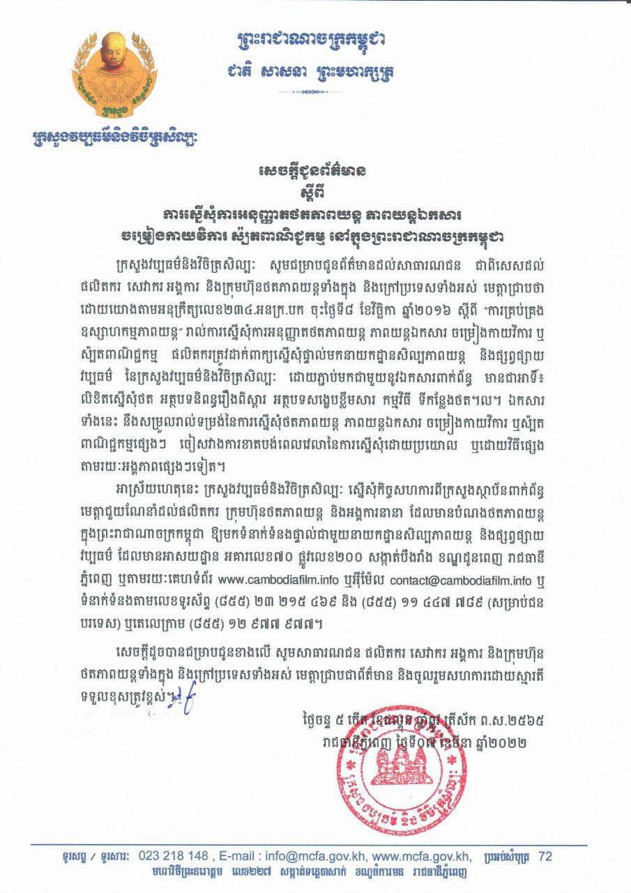 នៅថ្ងៃនេះក្រសួងវប្បធម៌ និងវិចិត្រសិល្បៈ បានចេញសេចក្តីជូនដំណឹងដល់សាធារណជនឲ្យបានជ្រាបថា ចាប់ពីពេលនេះទៅ រាល់ការថតភាពយន្ត ចម្រៀងកាយវិការ ស្ប៉តទាំងអស់ក្នុងព្រះរាជាណាចក្រកម្ពុជា ត្រូវស្នើសុំអនុញ្ញាតពីក្រសួងជាមុនសិន។