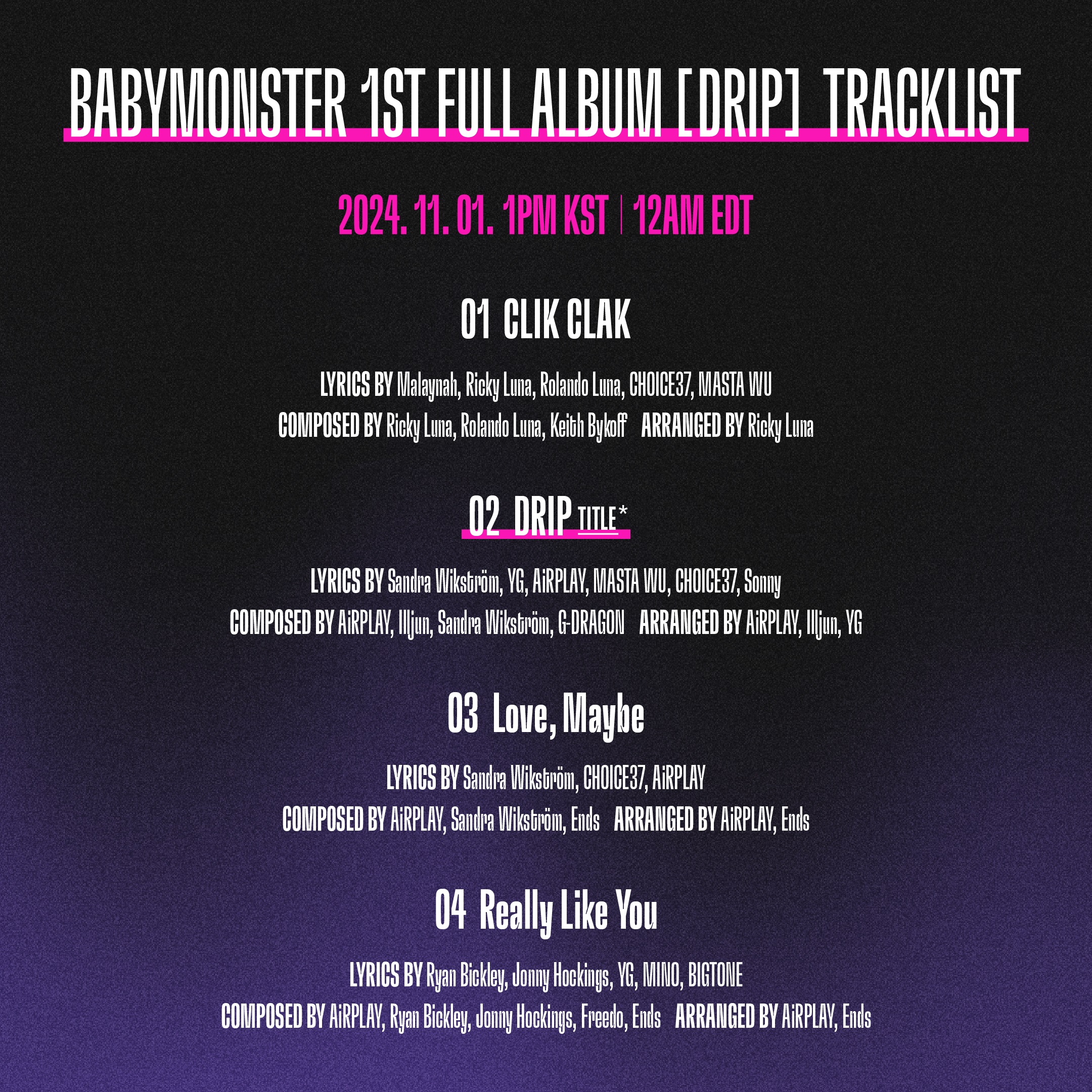 ស្ថាបនិក YG Entertainment លោក Yang Hyun-suk បានឱ្យដឹងថា ក្រុមចម្រៀងនារី BABYMONSTER នឹងចេញ Full Album ដំបូងរបស់ខ្លួនមានចំណងជើងថា “Drip” នៅថ្ងៃទី ១ ខែវិច្ឆិកាខាងមុខនេះ។ ការចេញផ្សាយអាល់ប៊ុមថ្មីនេះ នឹងជាការវិលត្រលប់មកវិញលើកដំបូងរបស់ពួកគេរយៈពេល ៤ ខែបន្ទាប់ពីបានចេញបទចម្រៀងរដូវក្ដៅ “Forever” កាលពីថ្ងៃទី១ ខែកក្កដា។