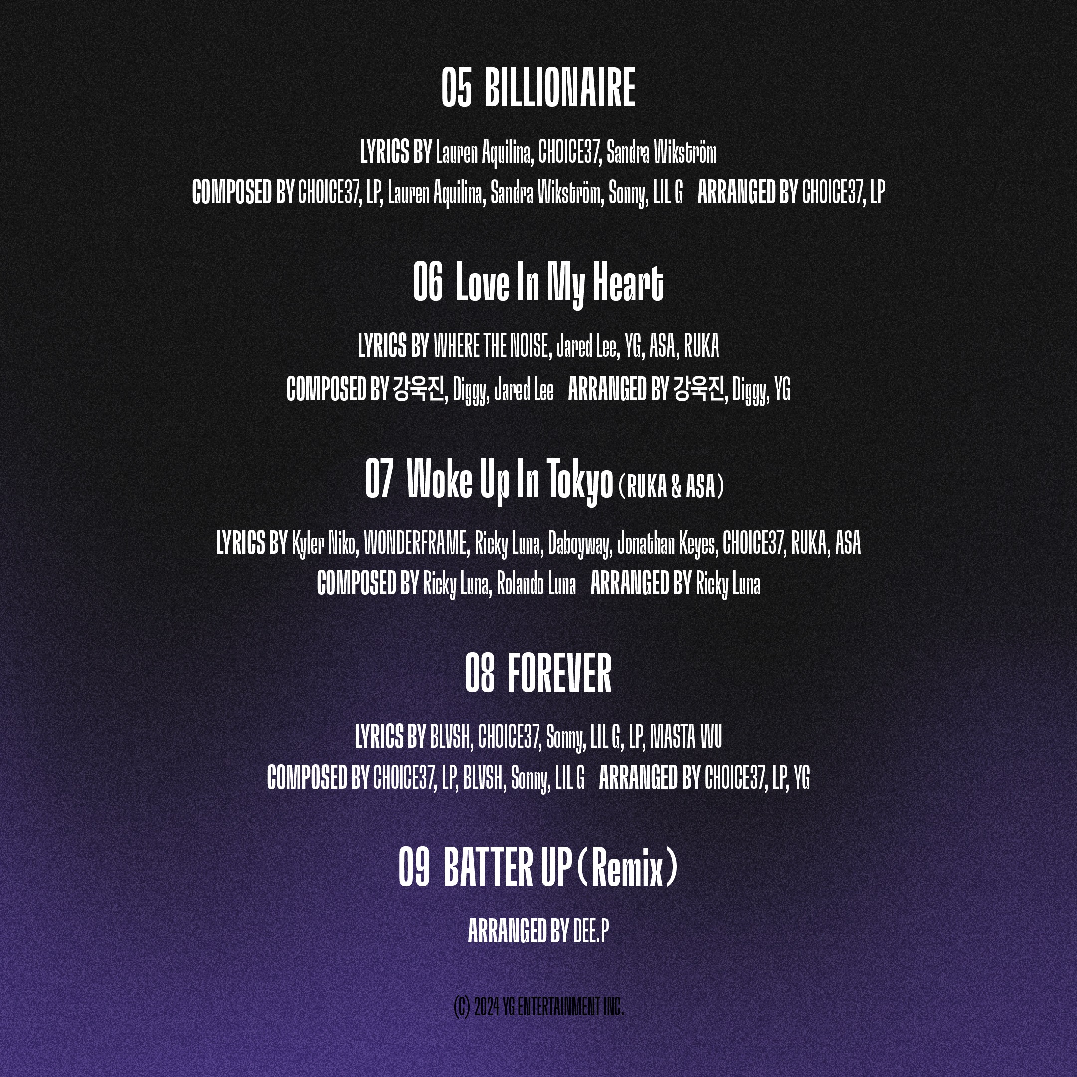 តាមរយៈវីដេអូដែលបានបង្ហោះនៅលើឆានែលផ្លូវការរបស់ YG Entertainment កាលពីថ្ងៃអង្គារ លោក Yang Hyun-suk ក៏បានបង្ហាញបញ្ជីបទចម្រៀង និងព័ត៌មានលម្អិតផ្សេងៗផងដែរ។ ផ្អែកតាមការប្រកាស អាល់ប៊ុម “Drip” នឹងមានបទចម្រៀងសរុបចំនួនប្រាំបួនបទ រួមមានបទ “Click Clack” ជាបទសំខាន់ និងបទផ្សេងៗទៀតដូចជា “Drip” “Love, Maybe” “Really Like You” “Billionaire” “Love In My Heart” និងបទ “Woke Up In Tokyo” ដែលច្រៀងដោយសមាជិក Ruka និង Asa ព្រមជាមួយបទ​ចម្រៀង​ដែល​បាន​ចេញកន្លងមកដូចជាបទ​ “Forever” និង​បទ “Batter Up (Remix)”។