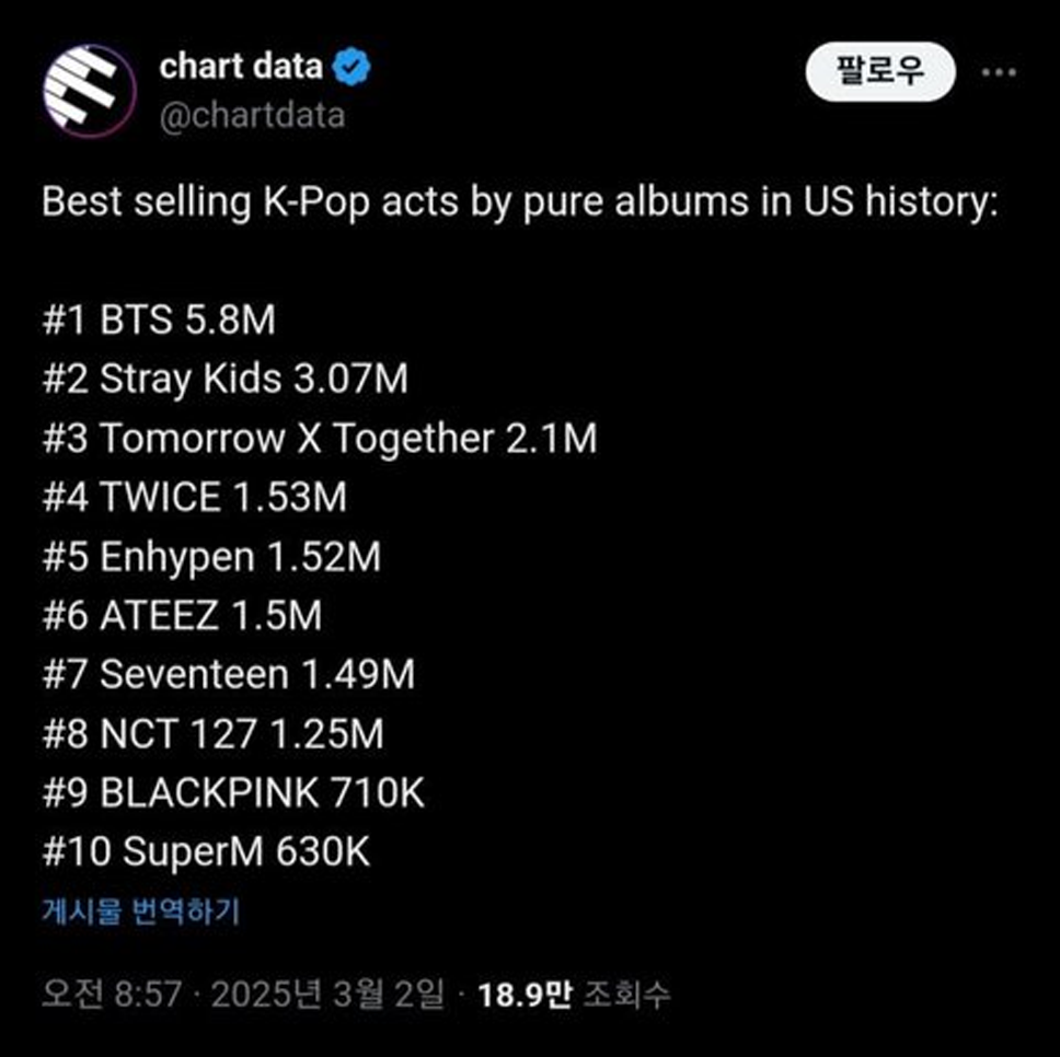 និយាយត្រឹមការលក់ សិល្បករ K-pop ជាច្រើនបានបង្កើតកំណត់ត្រា ជាពិសេសក្នុងការលក់អាល់ប៊ុមសុទ្ធ ដោយសំដៅទៅលើការលក់អាល់ប៊ុមជាក់ស្តែង ដោយមិនរាប់បញ្ចូលតួលេខ Streaming។ យោងតាមទិន្នន័យដែលចេញផ្សាយដោយ Chart Data នៅថ្ងៃទី៦ ខែមីនានេះ បានបង្ហាញថាក្រុមចម្រៀងប្រុស BTS បានគ្រងចំណាត់ថ្នាក់លេខ១ក្នុងបញ្ជី ‘សិល្បករ K-pop លក់អាល់ប៊ុមដាច់បំផុតនៅក្នុងប្រវត្តិសាស្ត្រសហរដ្ឋអាមេរិក’ ដោយអាចលក់បានជាង ៥,៨ លានអាល់ប៊ុមសរុប។
