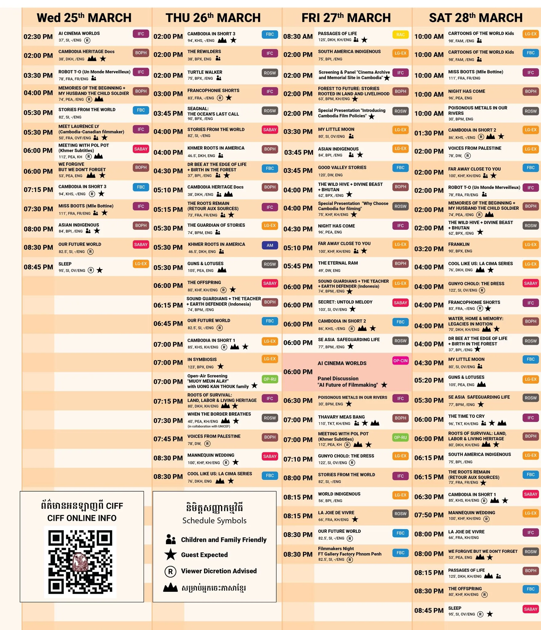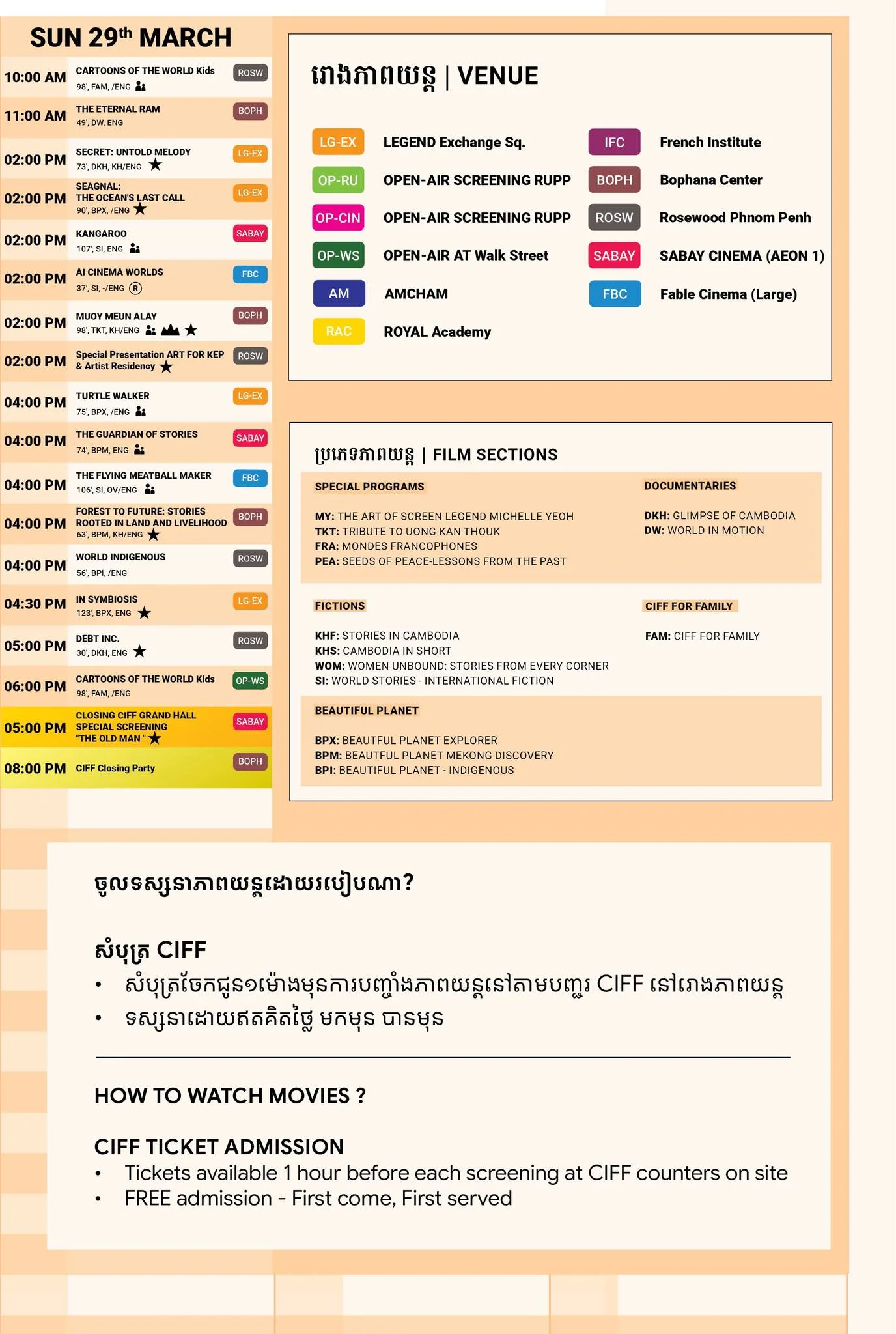 កុំ​ភ្លេច​ចូល​រួម! ចាប់​ពី​ម៉ោង ២ រសៀល នា​ថ្ងៃ​ទី ២៥ ខែ មិនា ឆ្នាំ ២០២៦ នេះ​ត​ទៅ កម្ពុជា​បាន​នាំ​យក​ភាពយន្ត​ទាំង​ខ្មែរ និង​បរទេស​ប្រមាណ​ ១៥០ រឿង មក​បញ្ចាំង​ជូន​ទស្សនិកជន​ទស្សនា ដោយ​ឥត​គិត​ថ្លៃ តាម​រយៈ​មហោស្រព​ភាពយន្ត​អន្តរជាតិ CIFF។