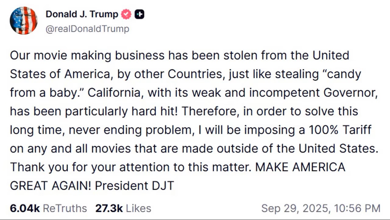 កាលពីថ្ងៃទី ២៩ ខែកញ្ញា ប្រធានាធិបតីអាមេរិក លោក Donald Trump បានចែករំលែកលើគណនី Truth Social ថា លោកនឹងយកពន្ធ ១០០ភាគរយពីខ្សែភាពយន្តទាំងអស់ដែលផលិតនៅក្រៅប្រទេស ដោយអះអាងថា ប្រទេសដទៃកំពុងតែលួចយកវិស័យផលិតភាពយន្តនេះពីសហរដ្ឋអាមេរិក។