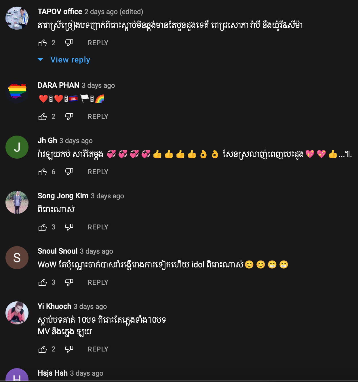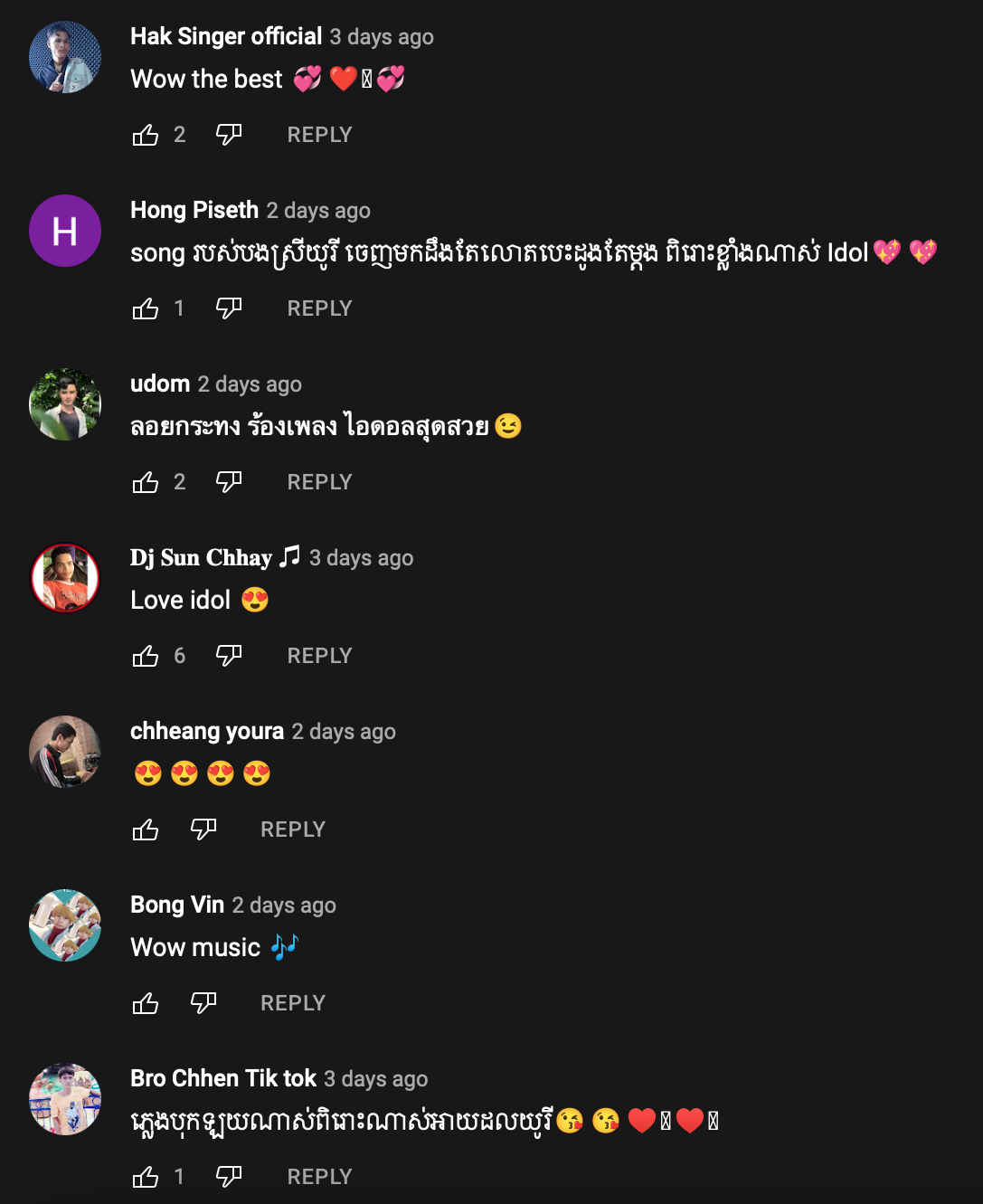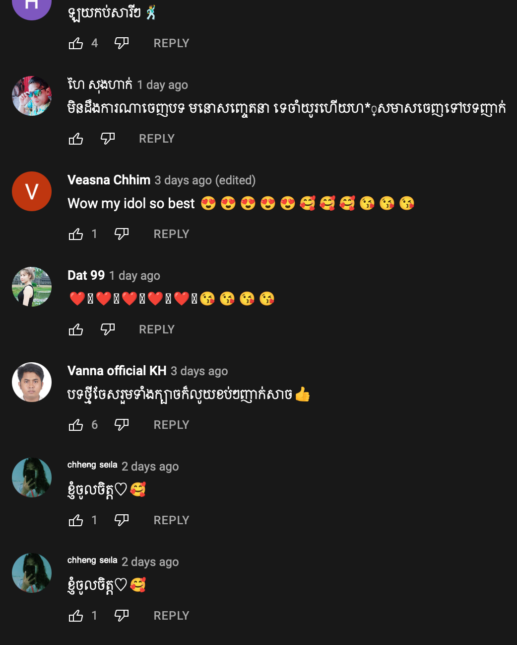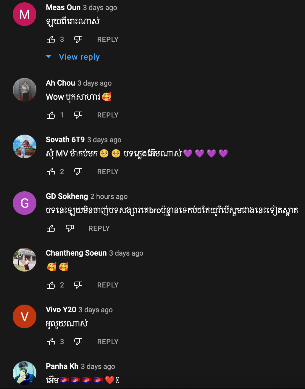 រីឯនៅលើឆានែលយូធូបផ្លូវការវិញក៏មានការសរសើរបទនេះច្រើនកុះករផងដែរ។ ទន្ទឹមនឹងការពោលសរសើរ ហ្វេនខ្លះបាន Comment សួរថា ពេលណាទើបកញ្ញា យូរី បញ្ចេញបទចម្រៀងមនោសញ្ចេតនាវិញខ្លះ? ព្រោះមួយរយៈនេះឃើញតារាចម្រៀងយ៉េៗរូបនេះ ច្រើនតែចេញបទញាក់កន្ត្រាក់អារម្មណ៍។