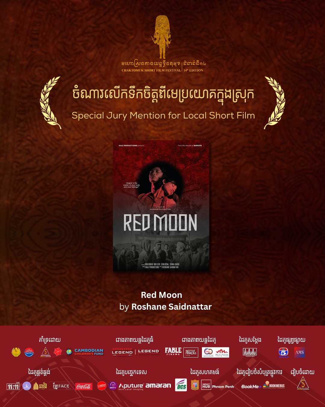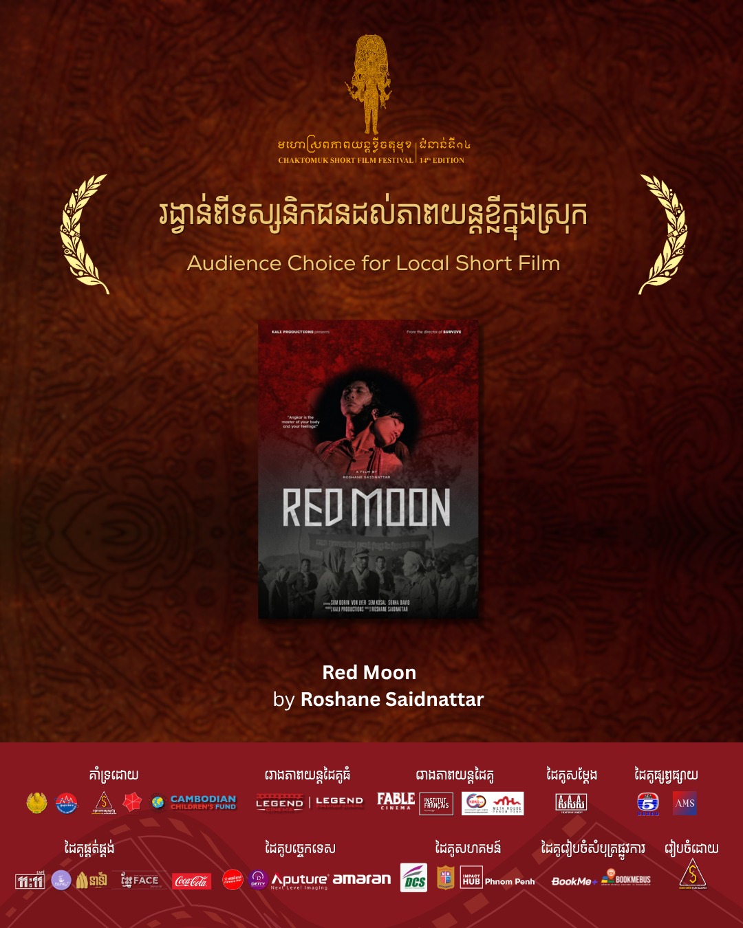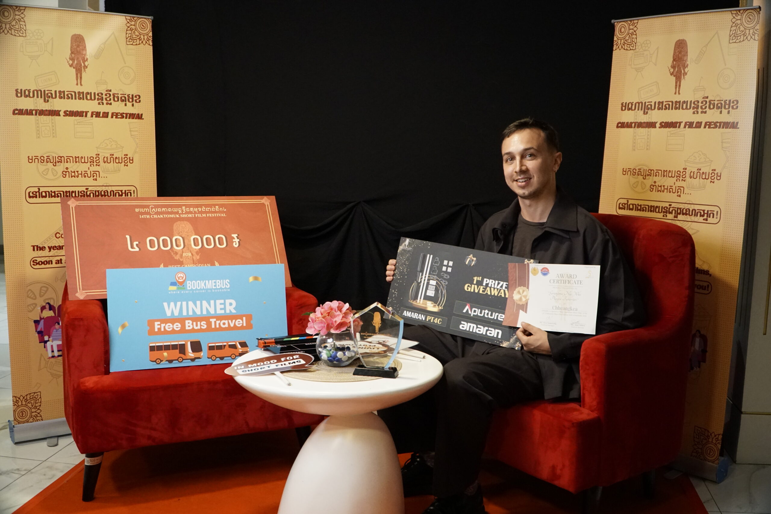 ពានរង្វាន់ភាពយន្តខ្លីខ្មែរល្អបំផុត (Winner) ៖ រឿង «ចៅសំណព្វចិត្ត» ឬ Grandma Nai who played favourite ដែលខ្សែរឿងមួយនេះត្រូវបានផលិតឡើងទាក់ទិនទៅនឹងជំនាន់។ រីឯភាពយន្តខ្លីខ្មែរល្អបំផុតលេខ២ បានទៅលើ រឿង«គ្រាំចិត្ត» ឬ HEARTACHE និងចុងក្រោយពានរង្វាន់ គណៈកម្មការ (jury mentioned award) និងពានរង្វាន់ជម្រើសទស្សនិកជន (Audience choice award) បានទៅលើ រឿង «ព្រះចន្ទក្រហម» ឬRED MOON ។