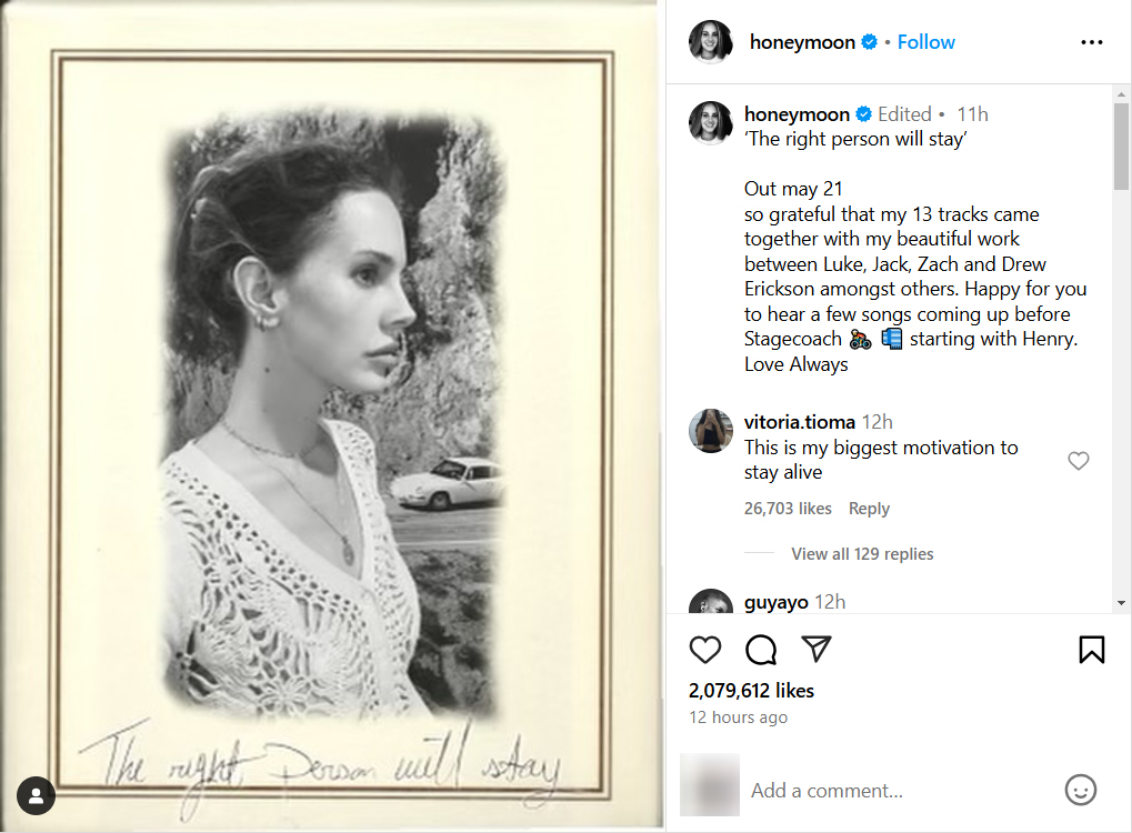 នៅថ្ងៃទី២៦ ខែវិច្ឆិកានេះ តារាចម្រៀង និងអ្នកនិពន្ធចម្រៀងអាមេរិក Lana Del Rey បានប្រកាសនៅលើ Instagram ថាអាល់ប៊ុមថ្មីរបស់នាងនឹងមានចំណងជើងថា “The Right Person Will Stay” ហើយនឹងចេញនៅថ្ងៃទី ២១ ខែឧសភា ឆ្នាំ ២០២៥ ដោយរួមមានបទចម្រៀងសរុបចំនួន ១៣ បទ ហើយបទចម្រៀងត្រៀមចេញដំបូងគេមានចំណងជើងថា “Henry” ។