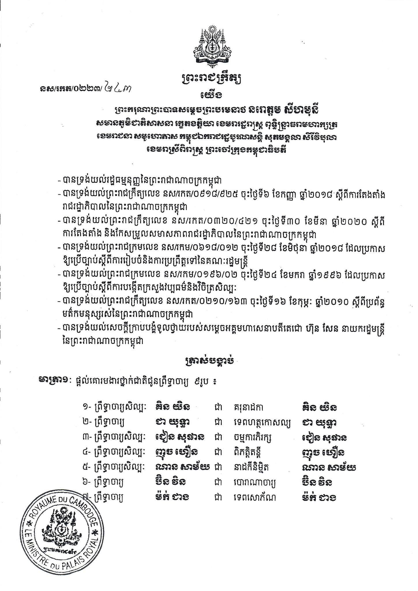 យោងតាមព្រះរាជក្រឹត្យ ចុះថ្ងៃទី៨ ខែកុម្ភៈ ឆ្នាំ២០២៣ បានផ្ដល់គោរមងារថ្នាក់ជាតិជូនព្រឹទ្ធាចារ្យចំនួន ៩ រូប ដែលឈានចូលវ័យជរាទៅហើយ និងនៅមានសមត្ថភាពផ្ដល់ចំណេះដឹងដល់សិល្បករ-សិល្បការិនីជំនាន់ក្រោយ។