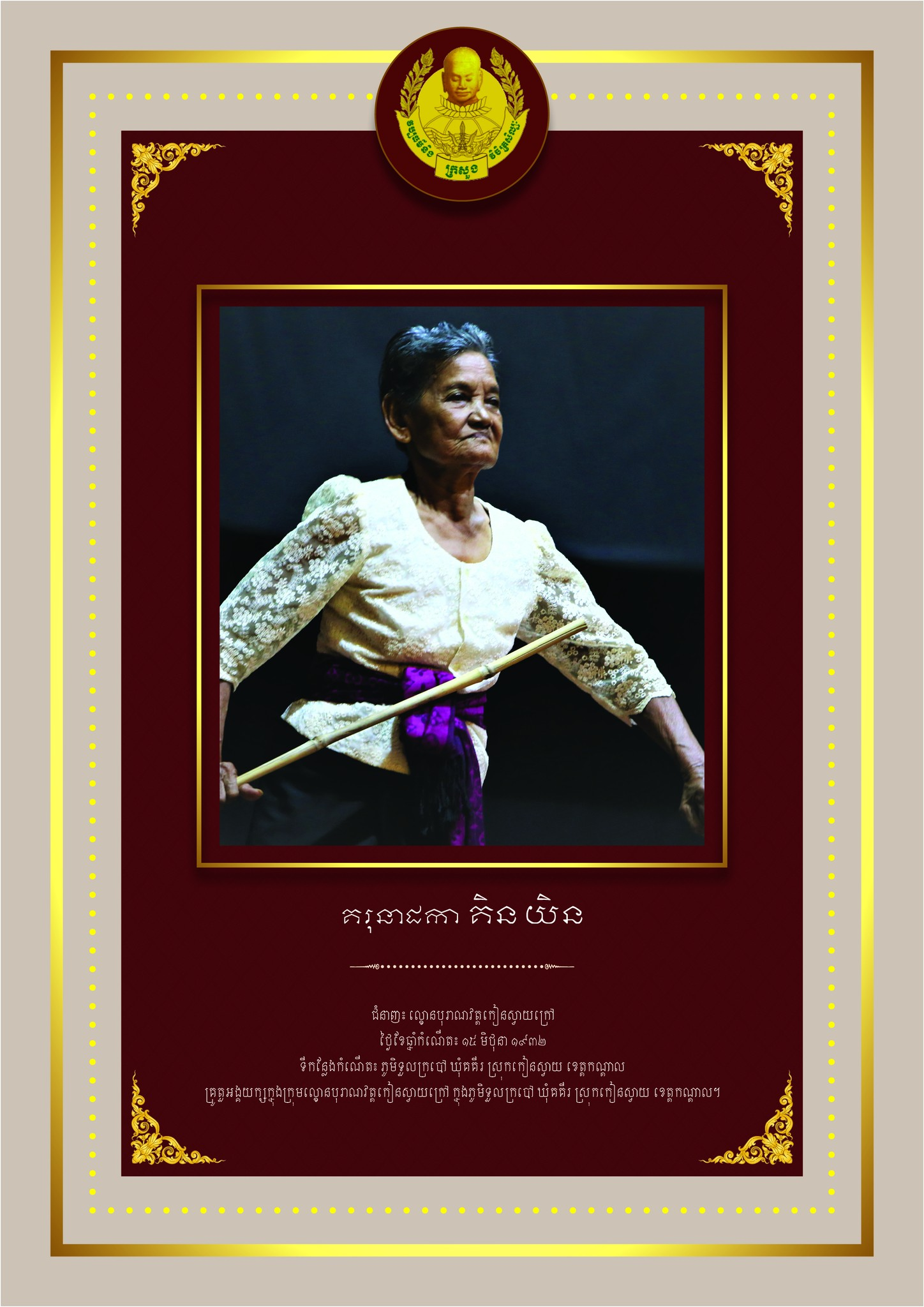 ១ គរុនាដកា គិន យិន កើតនៅថ្ងៃទី ១៥ មិថុនា ១៩៣២ ជំនាញល្ខោនបុរាណវត្តគៀនស្វាយក្រៅ