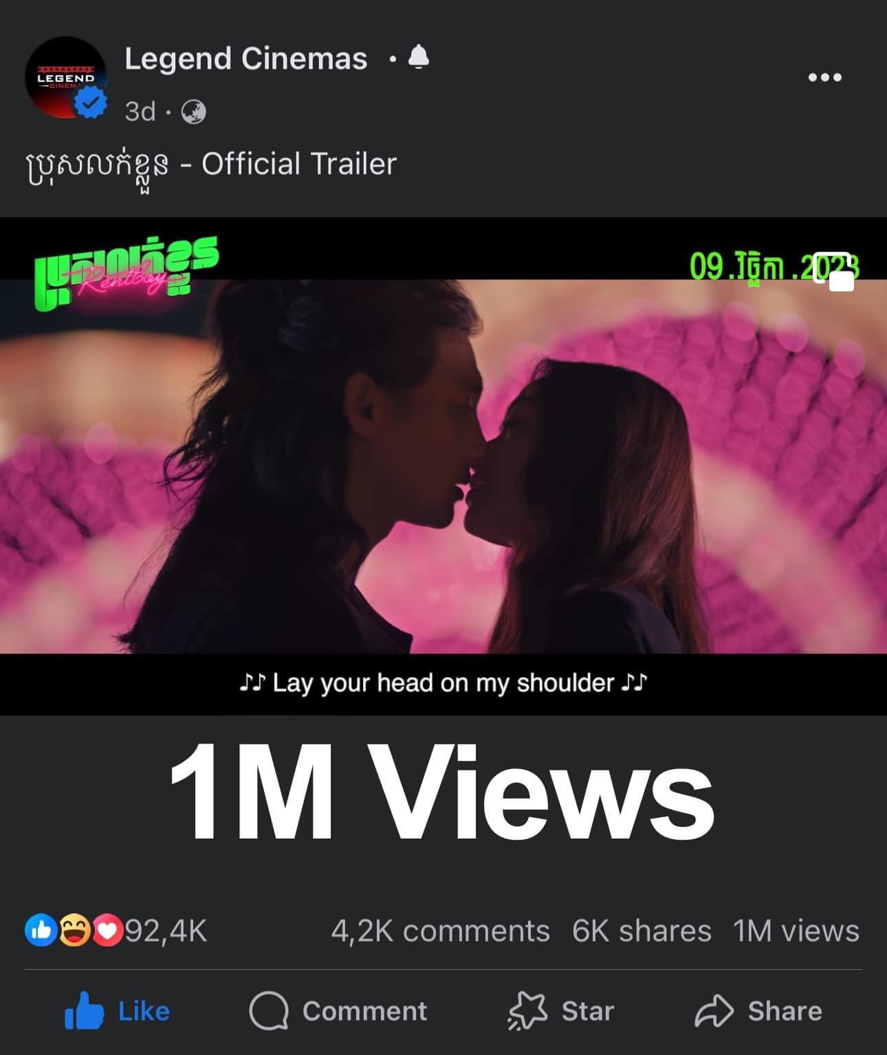 ពិតជាគួរឱ្យភ្ញាក់ផ្អើលខ្លាំងមែនទែន Official Trailer រឿង «ប្រុសលក់ខ្លួន» ដែលទំព័រហ្វេសប៊ុកផ្លូវការ Legend Cinemas បានបង្ហោះជាសាធារណៈ មានអ្នកចុចចូលទស្សនារហូតដល់ជាង ១ លានដង ក្នុងរយៈពេលត្រឹមតែ ៣ ថ្ងៃប៉ុណ្ណោះ។ តួរលេខដ៏ខ្ពស់នេះ ធ្វើឱ្យលោក លៀក លីដា ផលិតករ និងជាចាងហ្វាងផលិតកម្ម LD Entertainment មានការភ្ញាក់ផ្អើលខ្លាំង រហូតលាន់មាត់ឡើងថា តាំងពីធ្វើកុនមកមិនដែលមានទេ ១ លានដង តែ ៣ ថ្ងៃ។