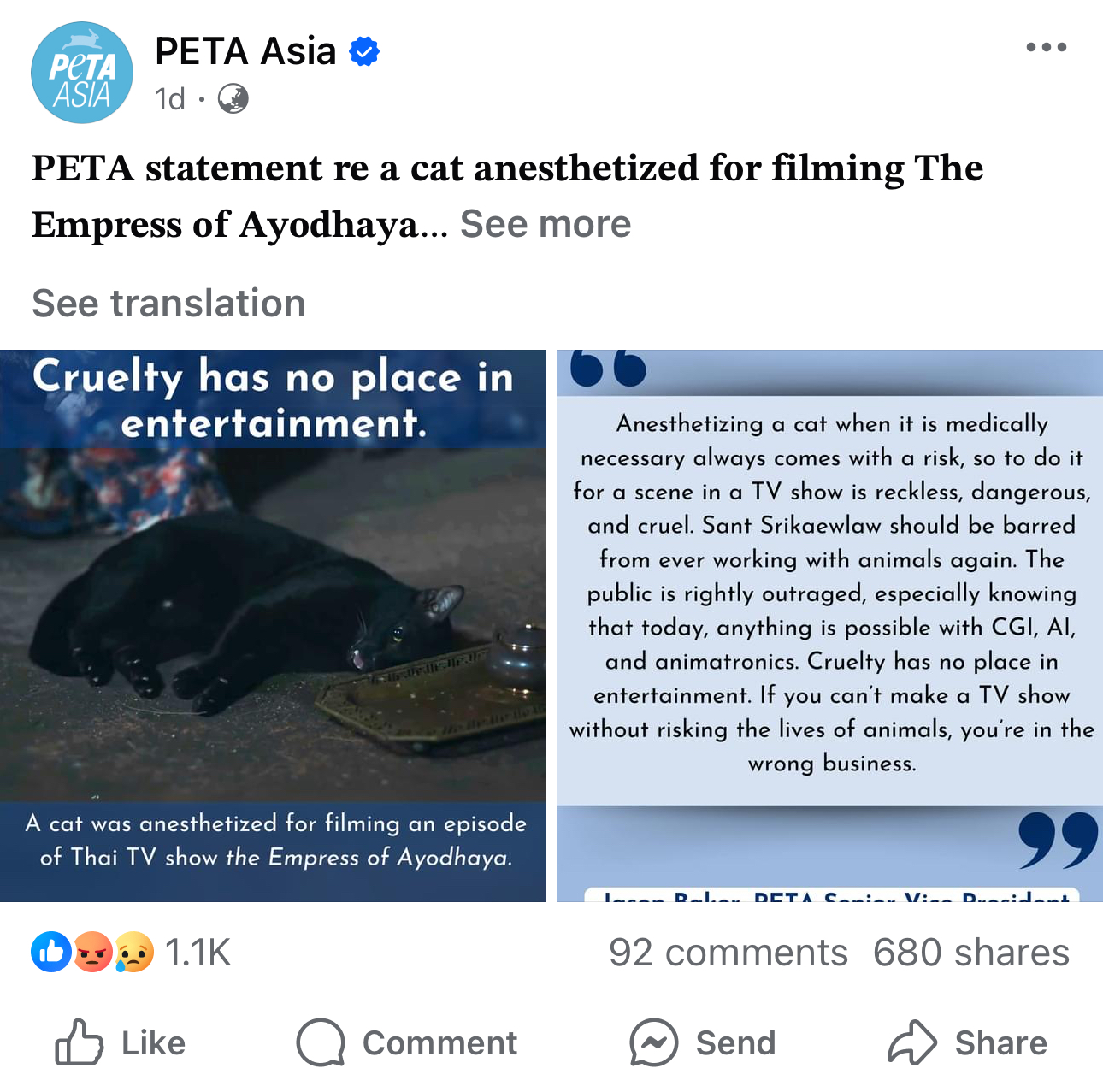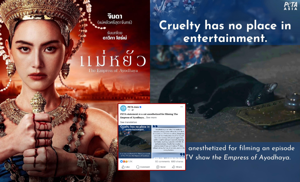 អង្គការ Peta Asia បានបង្ហោះសេចក្ដីថ្លែងការណ៍រិះគន់ទៅលើរឿង The Empress of Ayodhay របស់ថៃ ក្រោយមានការប្រើប្រាស់ថ្នាំសន្លប់ទៅលើឆ្មារ ព្រមលើកយកវិធីសាស្ត្រដែលអាចធ្វើទៅបានជំនួយ ដោយការទារុណកម្មសត្វ។