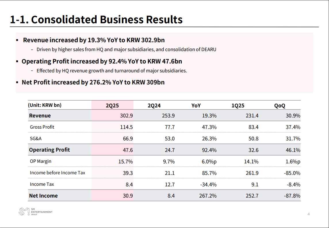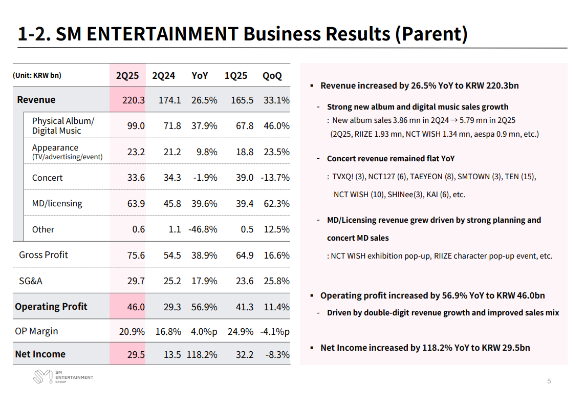 នៅថ្ងៃទី៦ ខែសីហានេះ ផលិតកម្ម SM Entertainment បានប្រកាសថា ប្រាក់ចំណូលសរុបប្រចាំត្រីមាសទី២ បានកើនឡើងចំនួន ១៩.៣ភាគរយ សរុបប្រមាណ ៣០២.៩ ពាន់លានវ៉ុន ឬប្រមាណ ២១៦.៥ លានដុល្លារអាមេរិក តាមរយៈការចេញស្នាដៃថ្មីរបស់ RIIZE, NCT WISH និង Aespa រួមទាំងការលក់វត្ថុអនុស្សាវរីយ៍។