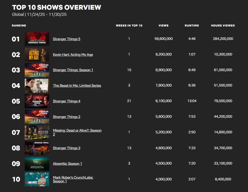 លុះនៅថ្ងៃទី២៦ ខែវិច្ឆិកា ពេលដែល ៤ភាគដំបូងនៃរដូវកាលបិទចក្រវាលបានចេញផ្សាយ Stranger Things ក៏ទទួលបានការគាំទ្រខ្លាំង ជាមួយនឹងចំនួនការទស្សនា ៥ថ្ងៃដំបូងដល់ទៅ ៥៩.៦លានដង ធ្វើឱ្យរដូវកាលថ្មីនេះ អាចចូលទៅក្នុងតារាងតែមួយភ្លាមៗ អមជាមួយនឹងរដូវកាលមុនសម្រាប់សប្ដាហ៍ថ្ងៃទី២៤ ដល់ថ្ងៃទី៣០ ខែវិច្ឆិកានេះ។