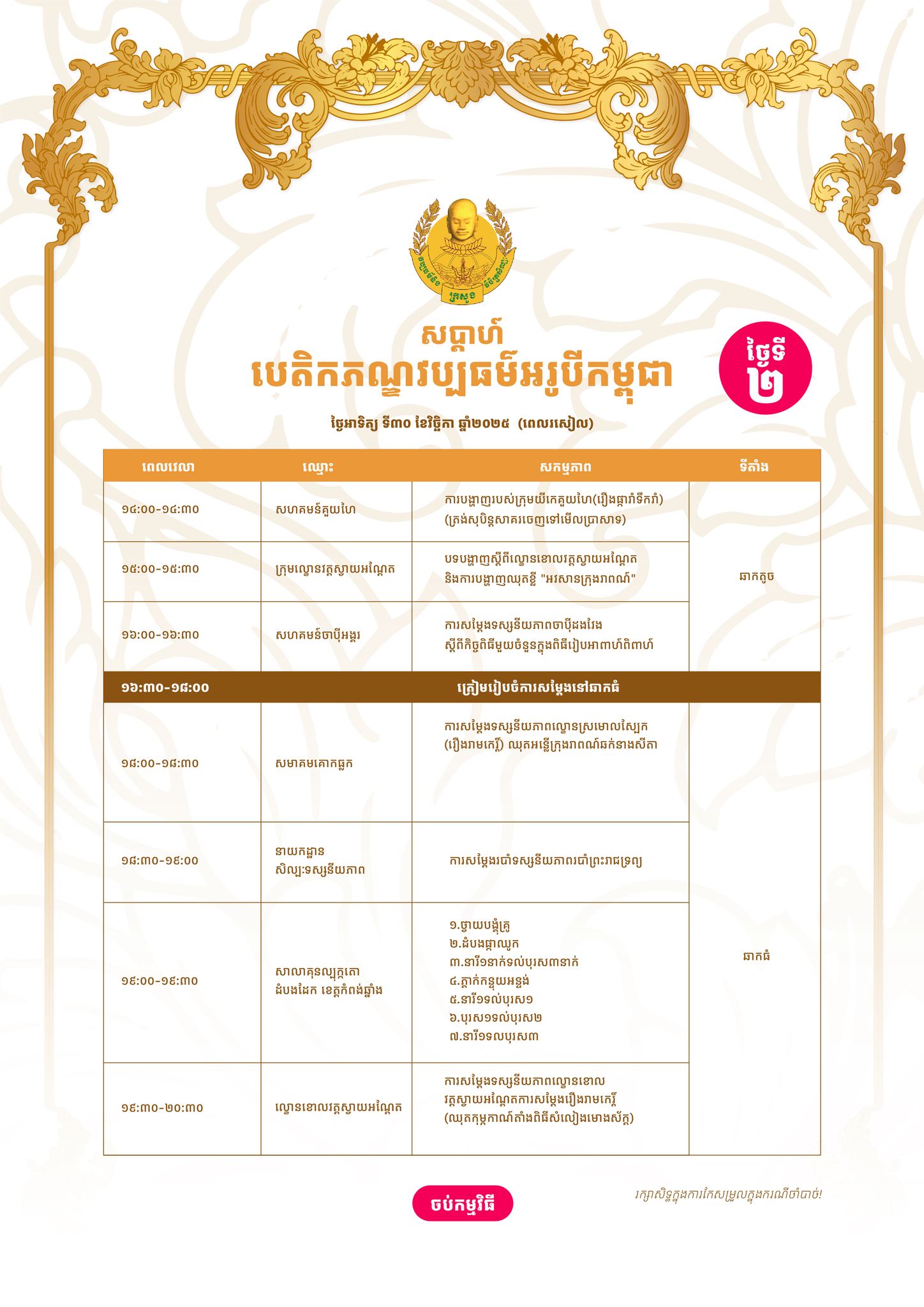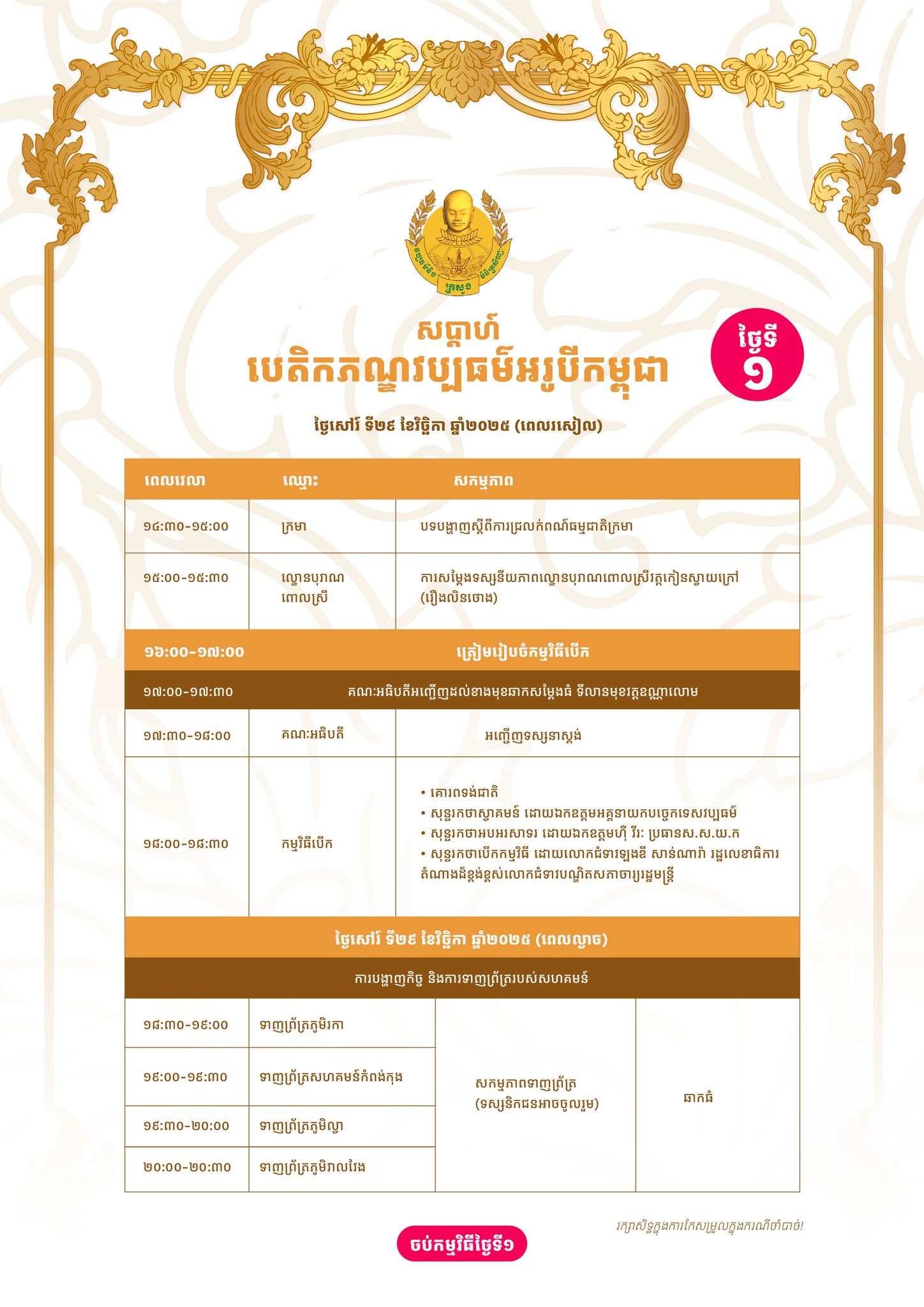 ក្នុងនោះនៅថ្ងៃទី២៩ ខែវិច្ឆិកា កម្មវិធីនឹងមានការសម្ដែងទស្សនីយភាពល្ខោនបុរាណពៅលស្រីវត្តកៀនស្វាយក្រៅ (រឿងលិនថោង) និងសកម្មភាពទាញព្រ័ត្រដែលទស្សនិកជនអាចចូលរួមបាន។