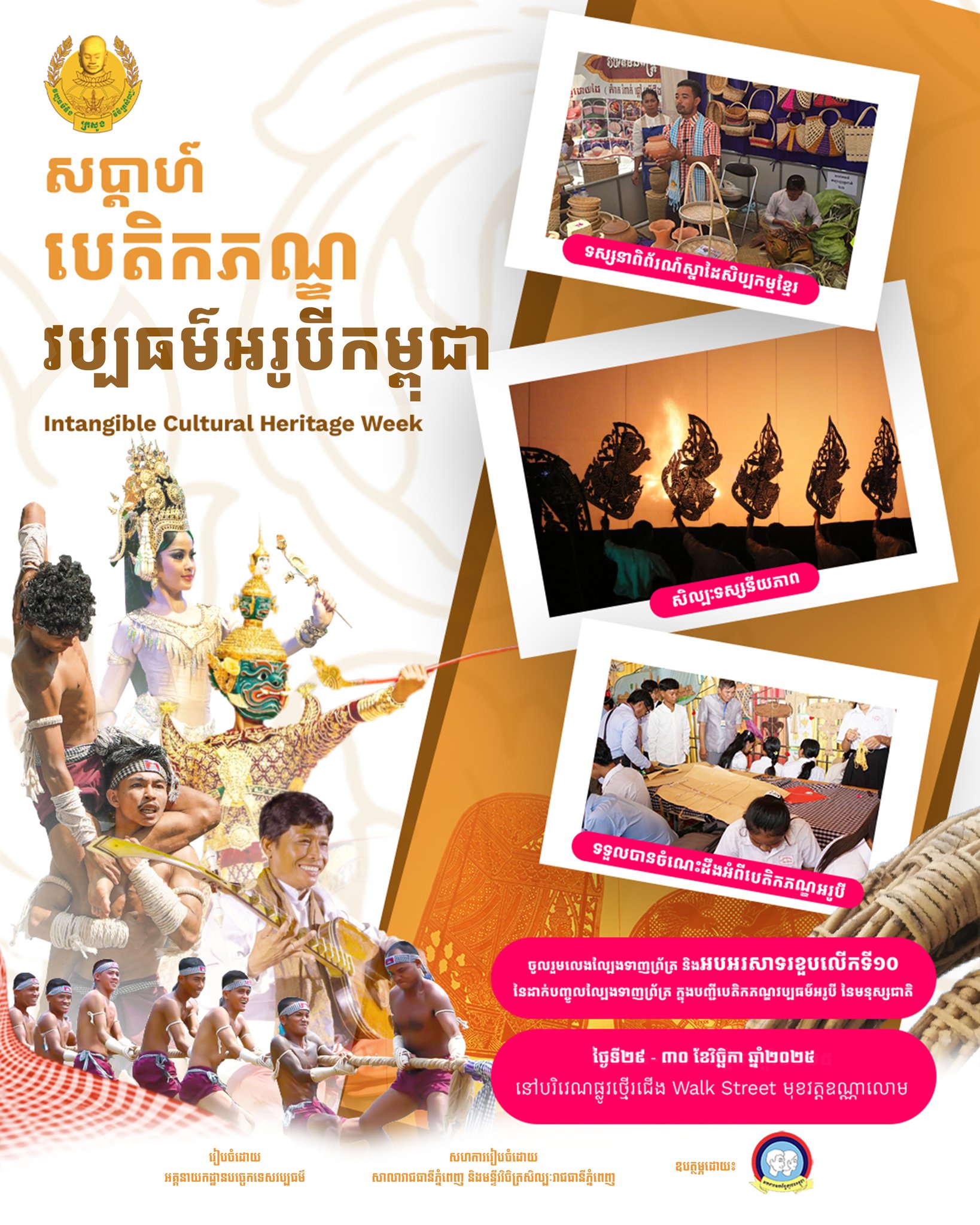 នាថ្ងៃសៅរ៍ អាទិត្យ ទី២៩ និង ៣០ ខែវិច្ឆិកា ឆ្នាំ២០២៥នេះ ក្រសួងវប្បធម៌និងវិចិត្រសិល្បៈ នឹងរៀបចំព្រឹត្តិការណ៍ធំមួយនិងលើកដំបូងគឺ “សប្តាហ៍បេតិកភណ្ឌវប្បធម៌អរូបីនៃកម្ពុជាលើកទី១ ឆ្នាំ២០២៥” នៅបរិវេណផ្លូវថ្មើរជើង Walk Street ម្ដុំសួនតេជោមាស តេជោយ៉ត មុខវត្តឧណ្ណាលោម។