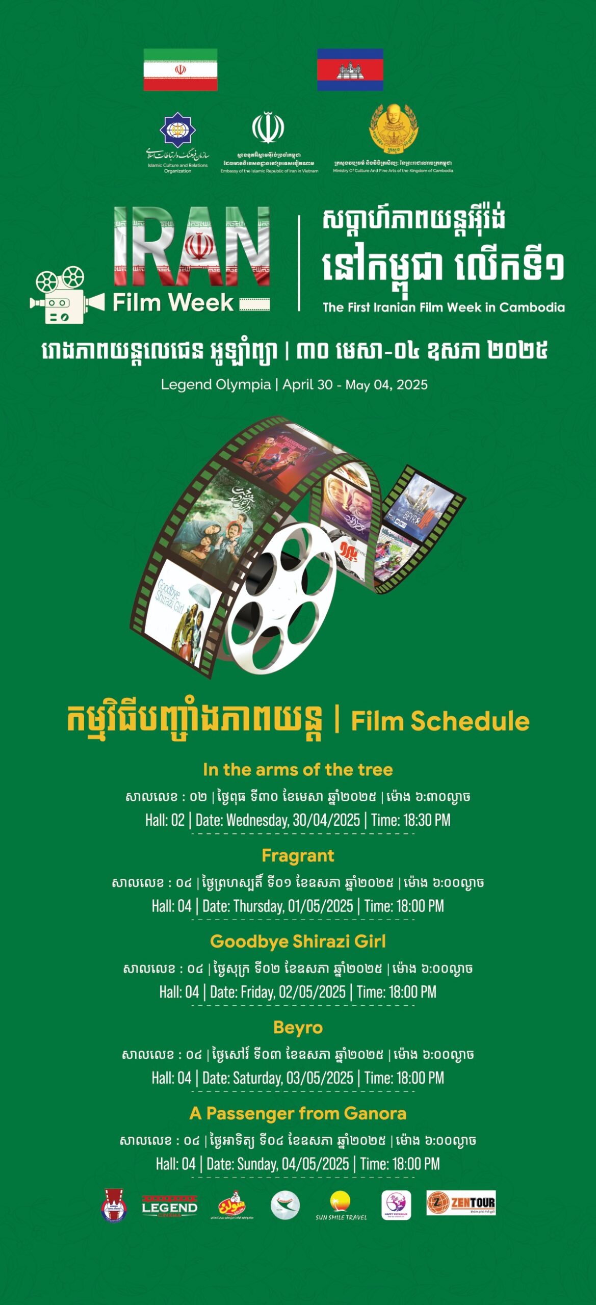 ក្រសួងវប្បធម៌ និងវិចិត្រសិល្បៈបានសហការជាមួយស្ថានទូតនៃសាធារណរដ្ឋអ៊ីស្លាមអ៊ីរ៉ង់ប្រចាំព្រះរាជាណាចក្រកម្ពុជា គ្រោងរៀបចំ «សប្ដាហ៍ភាពយន្តអ៊ីរ៉ង់ លើកទី១» ឆ្នាំ ២០២៥ ចាប់ពីថ្ងៃ៣០ មេសា ដល់ថ្ងៃ៤ ឧសភា ២០២៥ ។ នាឱកាសនោះ ក៏នឹងមានការចាក់បញ្ចាំងខ្សែភាពយន្តអ៊ីរ៉ង់ល្បីៗចំនួន ៥ ចំណងជើងជូនទស្សនាដោយឥតគិតថ្លៃនៅក្នុងរោងភាពយន្តលេជេន ជាន់ទី៦ នៃផ្សារទំនើបអូឡាំព្យា ដែលភាពយន្តទាំងនោះមានដូចជា៖ «In The arms of the Tree», «Fragrant», «Goodbye Shirazi Girl, Beyro», «A Passenger from Ganora»។ ភាពយន្តដែលត្រៀមសម្រាប់ការចាក់បញ្ចាំងនេះដែរជាភាពយន្តដែលបង្ហាញពីក្ដីស្រលាញ់ គ្រួសារនិងការតស៊ូផ្ទាល់ខ្លួននៃវប្បធម៌ និងសង្គមរបស់ប្រទេសអ៊ីរ៉ង។