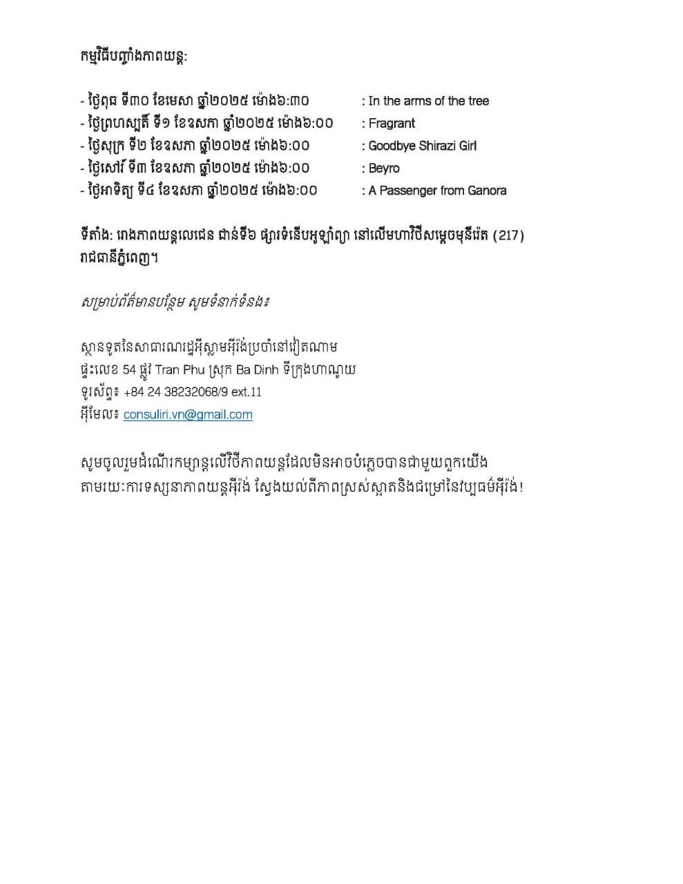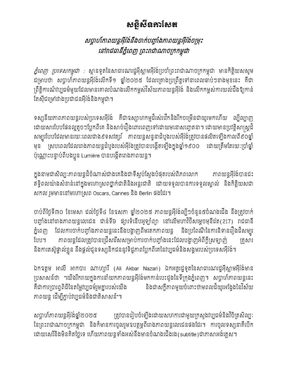 ខ្សែភាពយន្តល្បីៗរបស់ប្រទេសអ៊ីរ៉ង់ដែលសុទ្ធសឹងជាភាពយន្តល្បីៗ និងធ្លាប់ទទួលបានពានរង្វាន់អន្តរជាតិត្រូវបានយកមកចាក់បញ្ចាំងជូនទស្សនាដោយឥតគិតថ្លៃនៅក្នុងប្រទេសកម្ពុជា។ នេះបើតាមការជូនដំណឹងលើផេកផ្លូវការរបស់នាយកដ្ឋានសិល្បៈភាពយន្តនិងផ្សព្វផ្សាយវប្បធម៌។