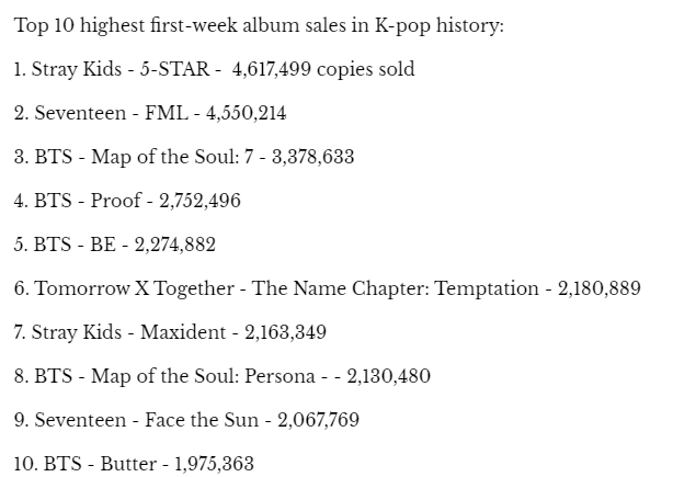 អ្នកស្រាវជ្រាវ Kim Jin Woo បានឱ្យដឹងថា “ការលក់អាល់ប៊ុម K-pop ត្រូវបានគេរំពឹងថានឹងកើនឡើងខ្ពស់ទៅៗនៅឆ្នាំនេះ។ ជាក់ស្ដែង ចំនួនអាល់ប៊ុម K-pop ដែលលក់បានចាប់ពីខែមករាដល់ខែឧសភាឆ្នាំនេះគឺប្រមាណ ៤២,៩ លានឈុត ដោយកើនឡើង ១៥,២ លានឈុតធៀបនឹងរយៈពេលដូចគ្នាកាលពីឆ្នាំមុន ហើយការលក់អាល់ប៊ុមសម្រាប់មួយឆ្នាំ២០២៣នេះគឺអាចនឹងឈានដល់ ១០០ លានឈុត” ៕
