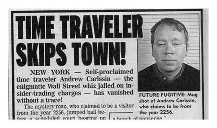 ត្រឡប់ទៅកាលពីឆ្នាំ ២០០៣ FBI បានឃាត់ខ្លួនបុរសម្នាក់មានឈ្មោះថា ”Andrew Corlssin”ពីបទ កេងប្រវ័ញ្ចទីផ្សាហិរញ្ញវត្ថុ។ គេបានប្រើដើមទុនត្រឹមតែ ៨០០ដុល្លារ តែបែរជារកចំណូលបានជាង៣៥០លានដុល្លារក្នុងរយៈពេលត្រឹមតែមិនប៉ុន្មានសប្ដាហ៍។ រូបគេបានទិញភាគហ៊ុនដែលមានភាពប្រថុយប្រថានខ្ពស់ចំនួន ១២៦ក្បាល។ ច្បាស់ណាស់ថាប្រាកដជាមិនមាននរណាម្នាក់ អាចប៉ាន់ស្មានទីផ្សារភាគហ៊ុនត្រូវទាំងអស់ ១២៦ក្បាលនោះទេ លើកលែងតែអ្នកមកពីលោកនៃអនាគត។