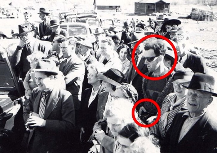 នេះជារូបភាពដែលថតនៅក្នុងព្រឹត្តិការណ៍ សម្ពោធស្ពាន Gold Bridge នៅប្រទេសកាណាដាក្នុងឆ្នាំ ១៩៤១។ នៅក្នុងចំណោមមនុស្សម្នាដែលចូលរួមក្នុងព្រឹត្តិការណ៍នោះមានបុរសម្នាក់តែងខ្លួនខុសប្លែកពីគេ ដោយមានពាក់វ៉ែនតាការពារពន្លឺថ្ងៃ អាវរងាមានរូត និងមានកាន់កាមេរ៉ា មើលទៅមិនមែនជាសម្ភារៈដែលមាននៅក្នុងសម័យកាលនោះឡើយ។