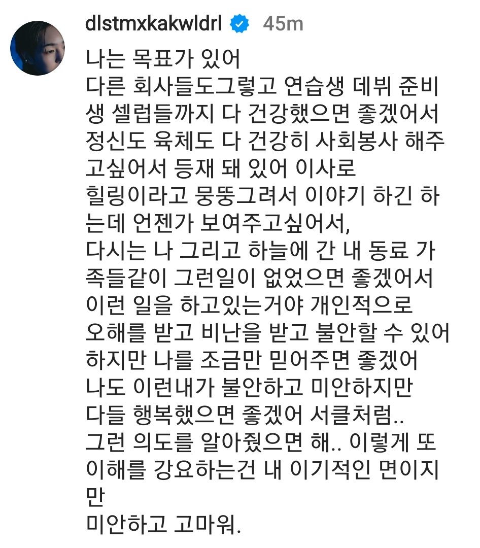 បកត្រឡប់ទៅកាលពីឆ្នាំ ២០១៧ Jonghyun សមាជិកក្រុម SHINee បានធ្វើអត្ដឃាតខ្លួនដោយសារមានជំងឺបាក់ទឹកចិត្តដែលធ្វើ​ឱ្យ Onew និងសមាជិកក្រុមដទៃពិបាកទទួលយកជាខ្លាំង។ ក្រោយមកទៀតក្នុងឆ្នាំ ២០១៩ មិត្ដរួមផលិតកម្ម និងរួមអាជីព គឺ Sulli សមាជិកក្រុម f(x) និង Goo Hara សមាជិក Kara សុទ្ធសឹងតែធ្វើអត្ដឃាតដោយសារមានជំងឺបាក់ទឹកចិត្ត។ ចំណែកឯ Moon Bin សមាជិកក្រុម Astro ថ្វីបើគ្មានការបញ្ជាក់ច្បាស់ពីមូលហេតុស្លាបរបស់លោក ប៉ុន្ដែអ្នកទាំងអស់ដែលបានចាកចេញសុទ្ធសឹងតែមានវ័យនៅក្មេង មិនទាន់ដល់ ៣០ ឆ្នាំផង។ ដូច្នេះទើប Onew បង្ហោះសារដើម្បីជាការរំឮក និងដាស់តឿនឱ្យតារាជំនាន់ក្រោយយកចិត្តទុកដាក់ចំពោះខ្លួនឯង៕