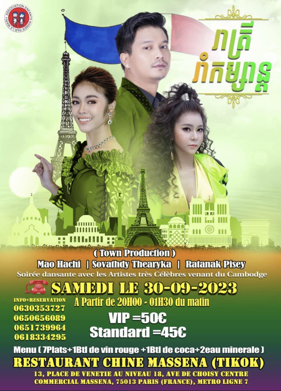 ក្នុងនោះគណនីហ្វេសប៊ុក Ly Ranette របស់អ្នកស្រី លី សុខុន ​ដែលគេស្គាល់ថា ជាអ្នក​ធានា​តារា​សម្តែង​ទៅ​​សម្តែង​នៅ​បារាំង បានបង្ហោះ poster មួយសន្លឹក បញ្ជាក់ឱ្យដឹងថា តារាចម្រៀងជួរមុខ ៣ រូបក្នុងផលិតកម្មថោន (Town Production) នឹងត្រូវច្រៀងសម្តែងនៅថ្ងៃទី ៣០ ខែកញ្ញា ឆ្នាំ ២០២៣ នៅ Restaurant CHINE MASSENA (TIKOK)  ប្រទេសបារាំង។ ដូច្នេះ ពុកម៉ែបងប្អូនខ្មែរកំពុងរស់នៅទីនោះ កុំភ្លេចមកចូលរួមរាំលេងកម្សាន្ត និងទទួលយកភាពសប្បាយរីករាយជាមួយសិល្បករខ្មែរ ដែលធ្វើដំណើរឆ្លងទ្វីបទៅសម្តែងឱ្យពុកម៉ែបងប្អូនបានទស្សនាកម្សាន្ត។