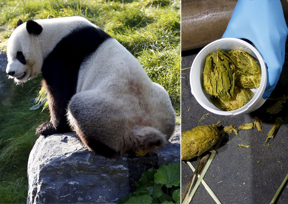 ក្នុងមួយថ្ងៃ ខ្លាឃ្មុំផេនដាចំណាយពេលស៊ីអាហារ ១៤ ទៅ ១៦ ម៉ោង ឬជាមធ្យមស្មើនឹង ១៨ គីឡូក្រាម ហើយបញ្ចេញចោល ៨ ទៅ ១០ គីឡូក្រាម។ លាមករបស់សត្វនេះចេញមកក្នុងទម្រង់ជាអាហារដែលវាស៊ីប្រហែល ៧០% ដូចជាឫស្សី និងរុក្ខជាតិផ្សេងទៀត ដោយសារមិនអាចរំលាយអាហារបានពេញលេញ។ នេះជាមូលហេតុដែលគេឱ្យខ្លាឃ្មុំផេនដាស៊ីស្លឹកតែ ហើយគេចម្រាញ់ស្លឹកតែដែលមានគុណភាពចេញពីលាមករបស់វាវិញ។ បើតម្លៃវិញមិនធម្មតាទេ កាលពីឆ្នាំ ២០១៤ ស្លឹកតែនេះមានតម្លៃរហូតទៅដល់ជាង ៧ ម៉ឺនដុល្លារក្នុងមួយគីឡូក្រាម ដែលត្រូវបានគេចាត់ទុកថាជាតែថ្លៃបំផុតលើពិភពលោកនាពេលនោះ។