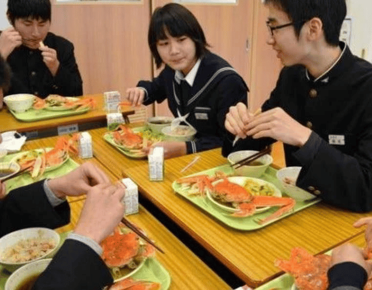 សាលាជប៉ុនមិនអនុញ្ញាតឲ្យសិស្សទៅញុំាអាហារនៅខាងក្រៅ ឬយកអាហារផ្ទាល់ខ្លួនមកឡើយ ដោយសាលានឹងផ្ដល់អាហារទៅឲ្យសិស្សគ្រប់គ្នា។ គោលបំណងក្នុងការហាមខាត់មិនឲ្យយកអាហារផ្ទាល់ខ្លួនមកសាលាគឺ ពួកគេចង់ឲ្យសិស្សទាំងអស់ទទួលបានអាហារដូចគ្នា ឬស្មើគ្នា បើទោះបីជាសិស្សនោះមកពីគ្រួសារក្រីក្រក៏ដោយ។