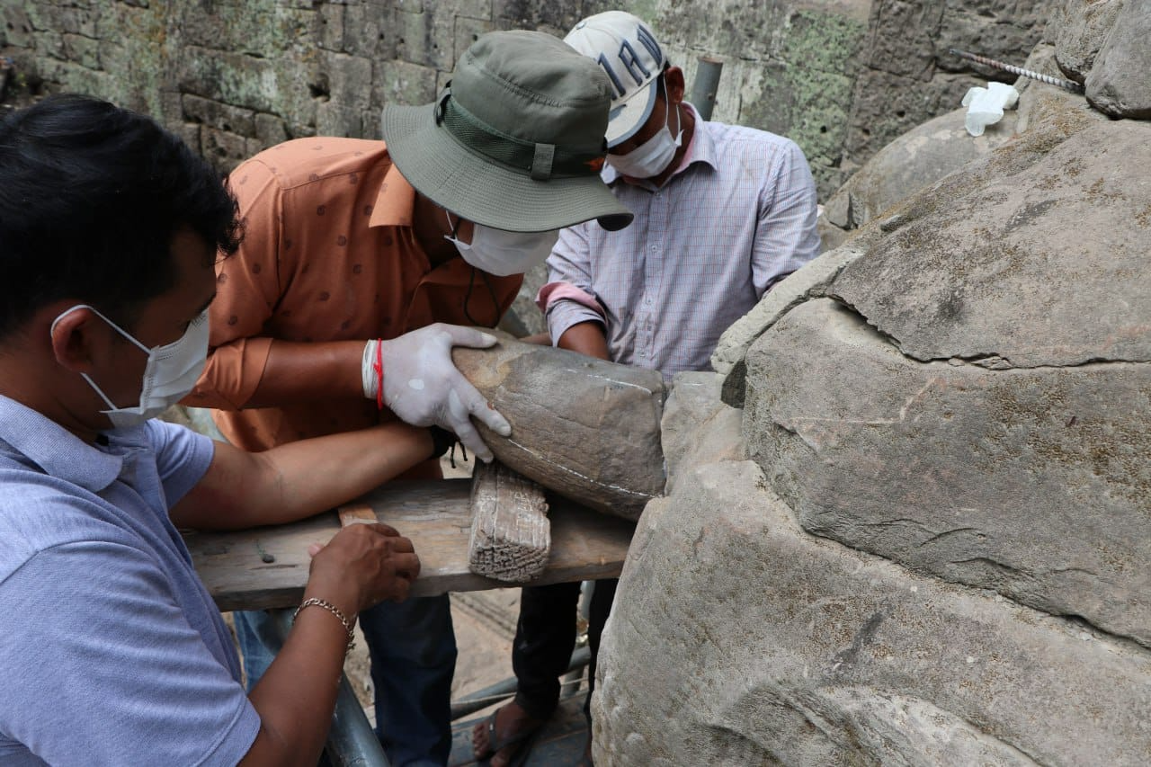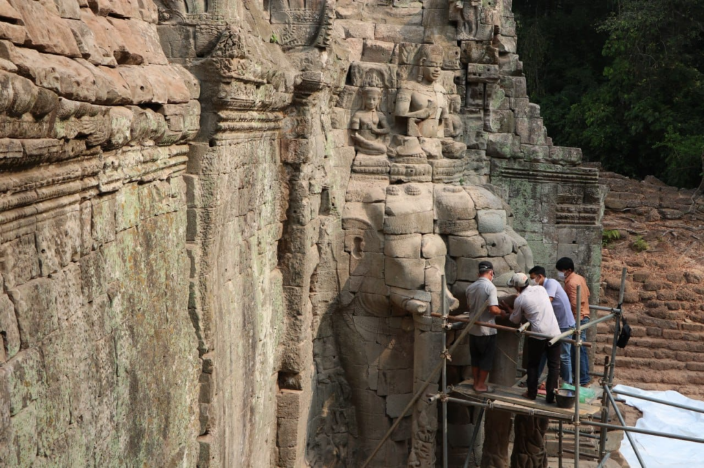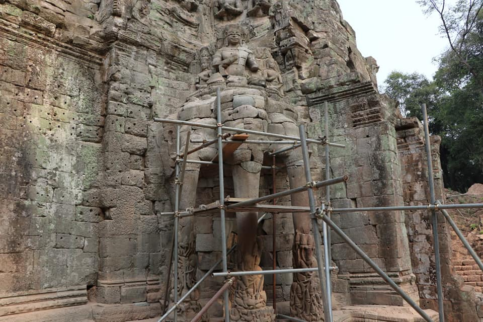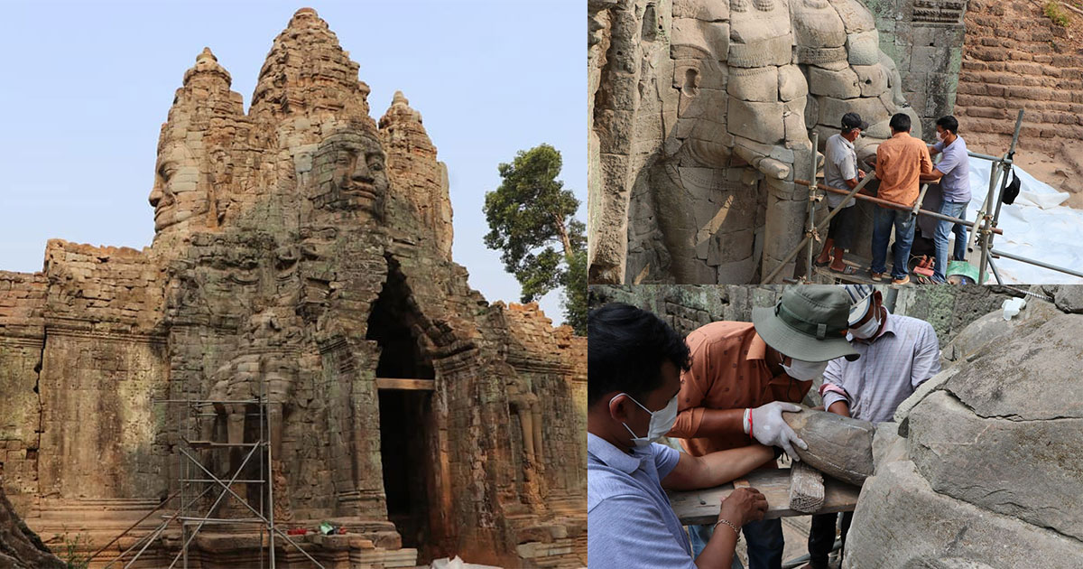 តាមរយៈទំព័រហ្វេសប៊ុក កាលពីព្រឹកថ្ងៃទី ២២ ខែមិនា ឆ្នាំ២០២៣ នេះអាជ្ញាធរជាតិអប្សរាបានឲ្យដឹងថាក្រុមការងារបច្ចេកទេសជួសជុល និងអភិរក្សថ្មនៃអាជ្ញាធរជាតិអប្សរា បានតភ្ជាប់ភ្លុកដំរីចំនួនមួយទៅក្បាលដំរីកណ្តាលផ្នែកខាងស្តាំរបស់ដំរីក្បាលបីនៅជ្រុងអគ្នេយ៍នៃខ្លោងទ្វារតាកាវ។ ការភ្ជាប់នេះ បានធ្វើឡើងបន្ទាប់ពីក្រុមការងារធ្វើកំណាយរកឃើញភ្លុកដំរី។