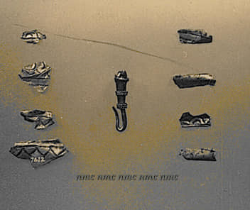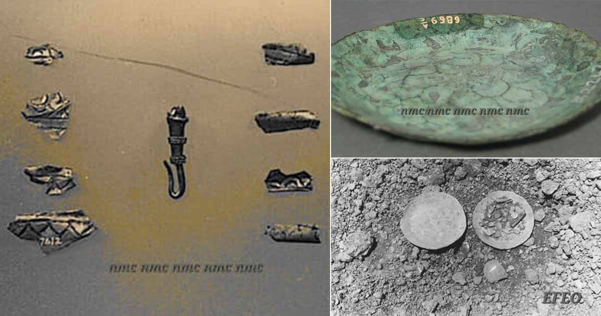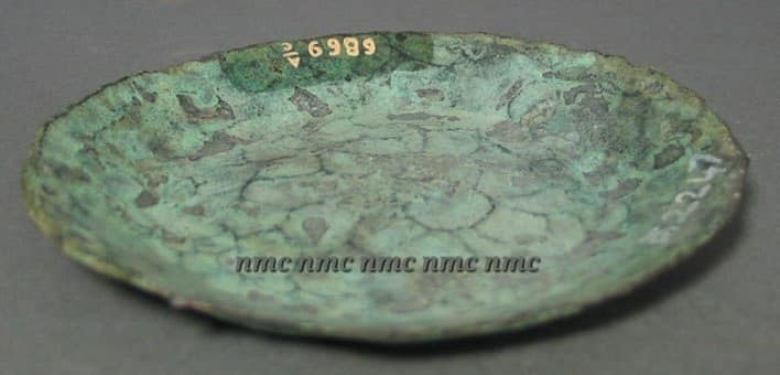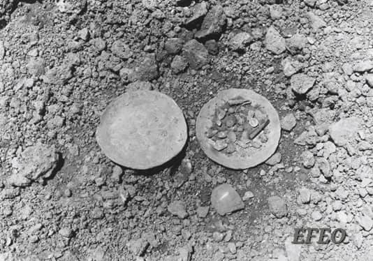 គ្រឿងបញ្ចុះទាំងនេះ រកឃើញនៅពេលដែលក្រុមការងារបានជីកពង្រឹងគ្រឹះក្លោងទ្វារត្រង់ទិសឥសាន នៅជម្រៅប្រមាណ៩០ ស.ម.។ ចានទាំងពីរនោះ ធ្វើពីលោហផ្សំទង់ដែង ដែលមានលេខចុះបញ្ជីគ. 2247.1-2។ នៅក្នុងចាន មានកូនទំពក់តូចមួយធ្វើអំពីប្រាក់ គ្រាប់ចង្រ្កង់អំពីសំរឹទ្ធិ១ បំណែកសន្លឹកសំរឹទ្ធិមួយដែលបត់ជាពីរ គ្រាប់ក្វាតចំនួន១៣ បំណែកដុំលោហៈតូច១ (គ.2224)៕