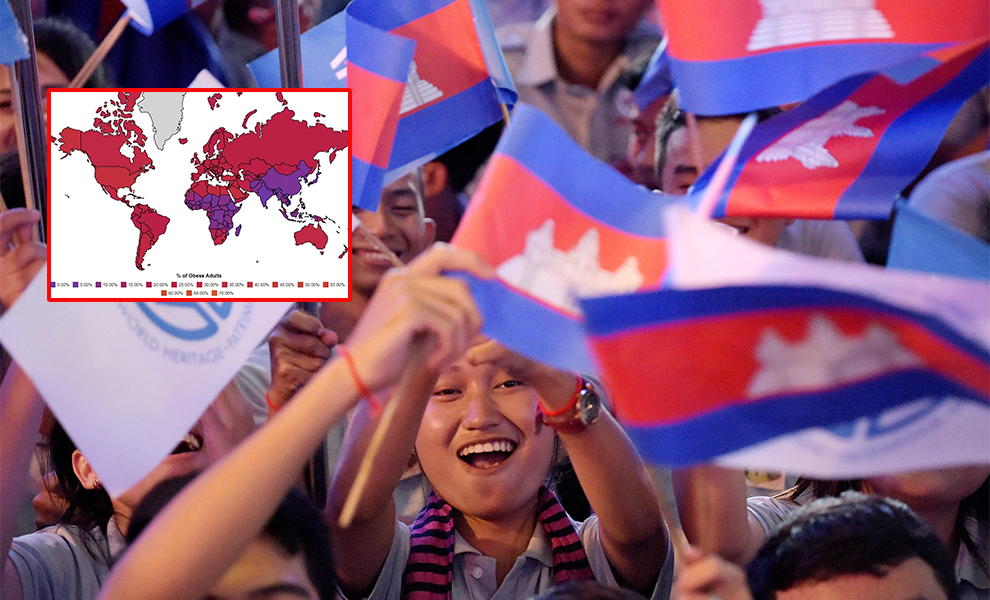 សម្រាប់កម្ពុជា ជាប់លេខ៧ ក្នុងចំណោមប្រទេសដែលសម្បូរយុវជនស្គមបំផុតក្នុងលោក។ តាមទិដ្ឋន័យដដែលនេះ កម្ពុជាមានយុវជនត្រឹម ២១.៧ ភាគរយប៉ុណ្ណោះដែលមានយុវជនលើសទម្ងន់ ខណៈវៀតណាមមានត្រឹម ១៨.៣ភាគរយ។ ដោយឡែកក្នុងបញ្ជីនេះមានប្រទេសអាស៊ានមួយទៀតគឺប្រទេសទីម័រខាងកើតដែលឈរលើកម្ពុជាមួយលេខ ហើយបើសម្រាប់តំបន់អាស៊ីទាំងមូលមាន ឥណ្ឌាជាប់លេខ២ បង់ក្លាដេសជាប់លេខ ៣ និងនេប៉ាល់ជាប់លេខ៥។