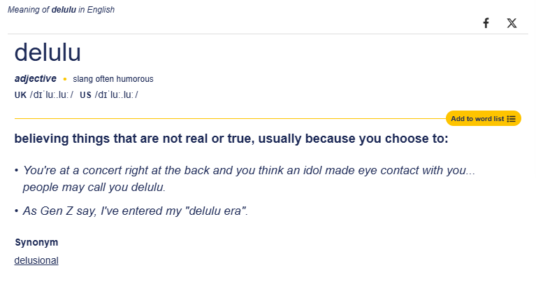 ក្រៅពីនេះ ក៏នៅមានពាក្យថា “Delulu” ដែលជាទម្រង់ខ្លីនៃពាក្យថា “Delusional” ដោយ Cambridge បានកំណត់ពាក្យនេះក្នុងថ្នាក់ពាក្យជា គុណនាម សំដៅទៅលើការជឿអ្វីមួយដែលមិនពិត ក៏ប៉ុន្តែអ្នកនៅតែជ្រើសរើសជឿលើរឿងនោះ។ តួយ៉ាង ប្រយោគដូចជា ខ្ញុំគិតថាមិត្តខ្ញុំ Delulu ព្រោះតែនាងបានលួចស្រឡាញ់តារាល្បីម្នាក់ ហើយនាងគិតថា គាត់ក៏ស្រឡាញ់នាងដូចគ្នា។