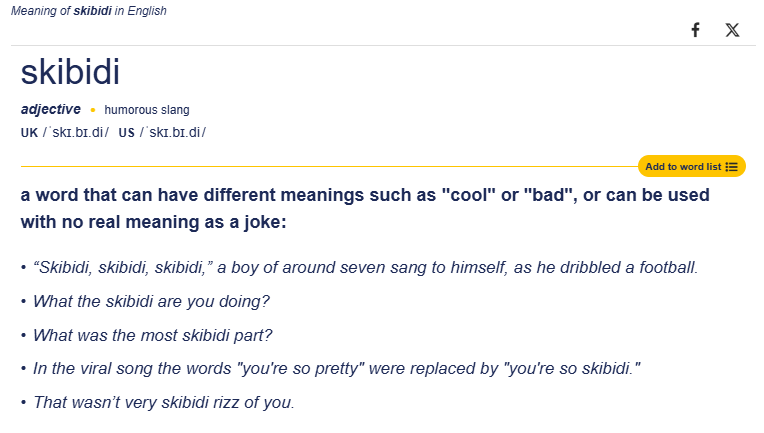 នៅក្នុងវចនានុក្រម Cambridge ពាក្យថា “Skibidi” នេះមានថ្នាក់ពាក្យជា គុណនាម មានន័យថា ឡូយ យ៉ាប់ ឬអាចយកទៅប្រើប្រាស់ដោយគ្មានអត្ថន័យអ្វីទាំងអស់ ដើម្បីជាការលេងសើច។ តួយ៉ាង ប្រយោគដូចជា “What the skibidi are you doing?” អាចប្រែជាខេមរភាសាថា “តើអ្នកកំពុងធ្វើអ្វី?”។