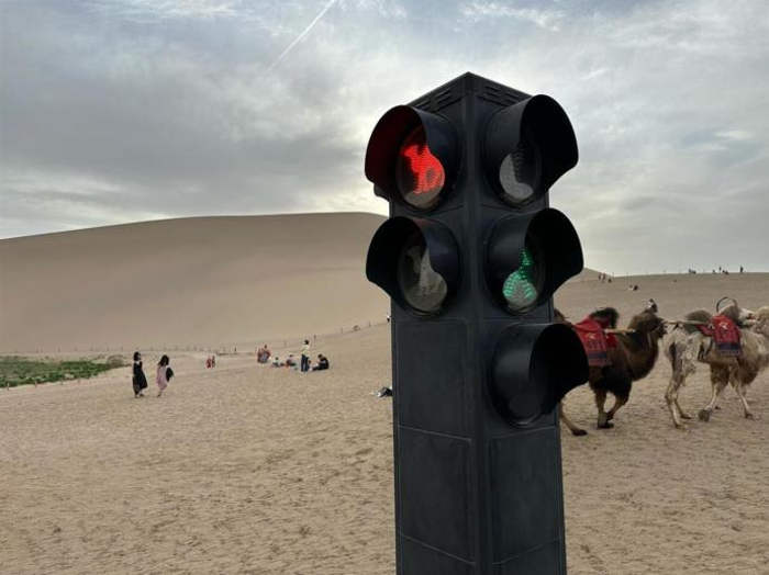 ជឿថារបស់មួយដែលគ្រប់គ្នាមិនរំពឹងថានឹងរកឃើញនៅកណ្តាលសមុទ្រខ្សាច់គឺជាភ្លើងស្តុបចរាចរណ៍ដែលដំណើរការ ប៉ុន្តែឥឡូវនេះអ្នកអាចរកឃើញភ្លើងស្តុបជាច្រើននៅក្នុងវាលខ្សាច់នៃភ្នំ Mingsha និងឧទ្យានបឹងធម្មជាតិ ក្នុងខេត្ត Gansu ភាគពាយ័ព្យនៃប្រទេសចិន។ ក្នុងកំលុងពេលវិស្សមកាលប្រចាំឆ្នាំនៅដើមខែឧសភា មនុស្សរាប់ម៉ឺននាក់បានសម្រុកទៅតំបន់ទេសចរណ៍ធម្មជាតិទាំងនេះ ហើយចូលរួមក្នុងសកម្មភាពផ្សេងៗ ដោយអ្វីដែលពេញនិយមបំផុតនោះគឺការជិះអូដ្ឋ។ នៅឆ្នាំ ២០២៣ មានសត្វអូដ្ឋប្រហែល ២៤០០ ក្បាលសម្រាប់ភ្ញៀវទេសចរជិះ ក៏ដូចជាអ្នកទេសចររាប់ម៉ឺននាក់ក្នុងមួយថ្ងៃនៅភ្នំ Mingsha ដែលបណ្តាលឱ្យមានបញ្ហាកកស្ទះចរាចរណ៍ធ្ងន់ធ្ងរ។ ជាសំណាងល្អ អាជ្ញាធរមូលដ្ឋានបានចេញដំណោះស្រាយដ៏ប៉ិនប្រសប់ ពោលគឺភ្លើងចរាចរណ៍អូដ្ឋ។