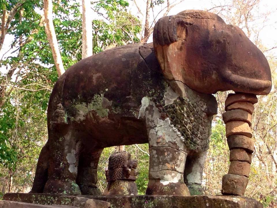 រូបចម្លាក់ដំរីមួយនេះស្ថិតនៅក្នុងប្រាសាទមួយមានឈ្មោះថាប្រាសាទដំរី ដែលជាប្រាសាទមួយក្នុងចំណោមបុរាណស្ថានដទៃទៀត នៃរាជធានីបុរាណកោះកេរ។ ប្រាសាទដំរីនេះទៀតសោតមានរូបចម្លាក់ដំរីជាច្រើន ប៉ុន្តែសុទ្ធតែត្រូវបានបែកបាក់ជាគំនរថ្មនៅលើដី លើកលែងតែរូបចម្លាក់កូនដំរីឈរទម្លាក់ប្រមោយចុះក្រោមមួយនេះ និងត្រូវបានធនាគារជាតិយកជាគំរូដាក់ចូលក្នុងក្រដាសប្រាក់តែម្ដង។