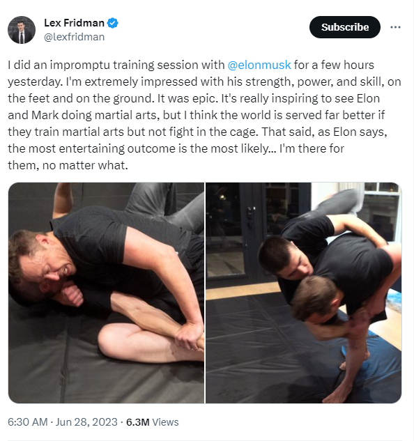 នៅព្រឹក ថ្ងៃទី ២៨ ខែមិថុនា ឆ្នាំ២០២៣ ម្ចាស់កម្មវិធី Podcast ដ៏ពេញនិយម និងជាកីឡាករជូជីតស៊ូខ្សែក្រវាត់ខ្មៅ លោក Lex Fridman បានបង្ហោះឱ្យដឹងថា Elon Musk កំពុងហ្វឹកហាត់ជាមួយនឹងខ្លួនដើម្បីត្រៀមការប្រយុទ្ធដ៏ធំរបស់គាត់ជាមួយ Mark Zuckerberg។