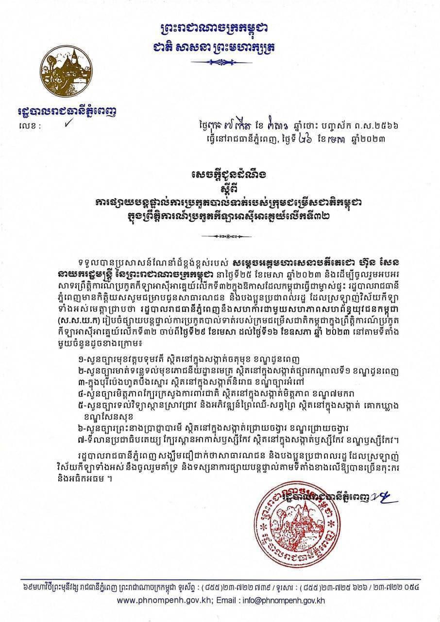 រដ្ឋបាលរាជធានីភ្នំពេញ បានឲ្យដឹងថា ខ្លួននឹងសហការជាមួយសហភាពសហព័ន្ធយុវជនកម្ពុជា (ស.ស.យ.ក) រៀបចំផ្សាយបន្តផ្ទាល់ការប្រកួតបាល់ទាត់របស់ក្រុមជម្រើសជាតិកម្ពុជាក្នុងព្រឹត្តិការណ៍ប្រកួត កីឡាអាស៊ីអាគ្នេយ៍លើកទី៣២ ចាប់ពីថ្ងៃទី២៩ ខែមេសា ដល់ថ្ងៃទី១៦ ខែឧសភា ឆ្នាំ ២០២៣ នៅតាមទីតាំង មួយចំនួនដូចខាងក្រោម៖