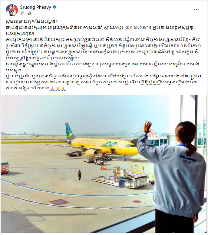 កីឡាការនី ស្រួង ភាវី បានរៀបរាប់នៅលើទំព័រហ្វេសប៊ុកកាលពីព្រឹកថ្ងៃទី ៣០ ខែឧសភា ឆ្នាំ២០២៣ ថា៖ «សូមជម្រាបពុកម៉ែបងប្អូន! នាងខ្ញុំបានចុះកុងត្រាជាមួយក្រុមហ៊ុនអាកាសចរណ៍ ស្កាយអង្គរ SKY ANGKOR ក្នុងនាមជាទូតសុច្ឆន្ទៈរបស់ក្រុមហ៊ុន។ ការចុះកុងត្រានេះខ្ញុំមិនយកប្រាក់សម្រាប់ខ្លួនឯងទេ គឺខ្ញុំបានបង្វិលទៅជាកិច្ចការសប្បុរសធម៌វិញ។ គឺថាប្រសិនបើខ្ញុំត្រូវមានកិច្ចការសប្បុរសធម៌ត្រូវធ្វើ ឬមានប្អូនៗ ក៏ដូចជាប្រជាជនខ្មែរយើងដែលមានជីវភាពខ្វះខាត ហើយត្រូវបានអង្គការសប្បុរសធម៌របស់នាងខ្ញុំធានាពួកគាត់មកព្យាបាលជំងឺនៅប្រទេសកូរ៉េ គឺមិនតម្រូវឱ្យយកប្រាក់ពីពួកគាត់ឡើយ។ ការស្នើលក្ខខណ្ឌរបស់នាងខ្ញុំនេះ គឺបានខាងក្រុមហ៊ុនទទួលយល់ព្រមដោយសេចក្ដីសោមនស្សរីករាយទាំងអស់គ្នា»។