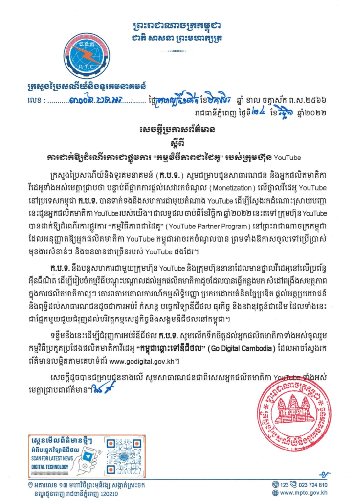 យោងតាមសេចក្ដីប្រកាសក្រសួងប្រៃសណីយ៍និងទូរគមនាគមន៍ (ក.ប.ទ.) ដែលបានចេញផ្សាយថ្ងៃទី ២៤ ខែវិច្ឆិកា ឆ្នាំ ២០២២ នេះបានឲ្យដឹងពីការដាក់ឱ្យដំណើរការជាផ្លូវការ “កម្មវិធីភាពជាដៃគូ” របស់ក្រុមហ៊ុន YouTube ជាផ្លូវការ។ បន្ទាប់ពីផ្អាកការផ្ដល់សេវារកចំណូល (Monetization) លើថ្នាលវីដេអូ YouTube នៅប្រទេសកម្ពុជា ក.ប.ទ. បានទាក់ទងនិងសហការជាមួយតំណាង YouTube ដើម្បីស្វែងរកដំណោះស្រាយបញ្ហានេះជូនអ្នកផលិតមាតិកា YouTube របស់យើង។
